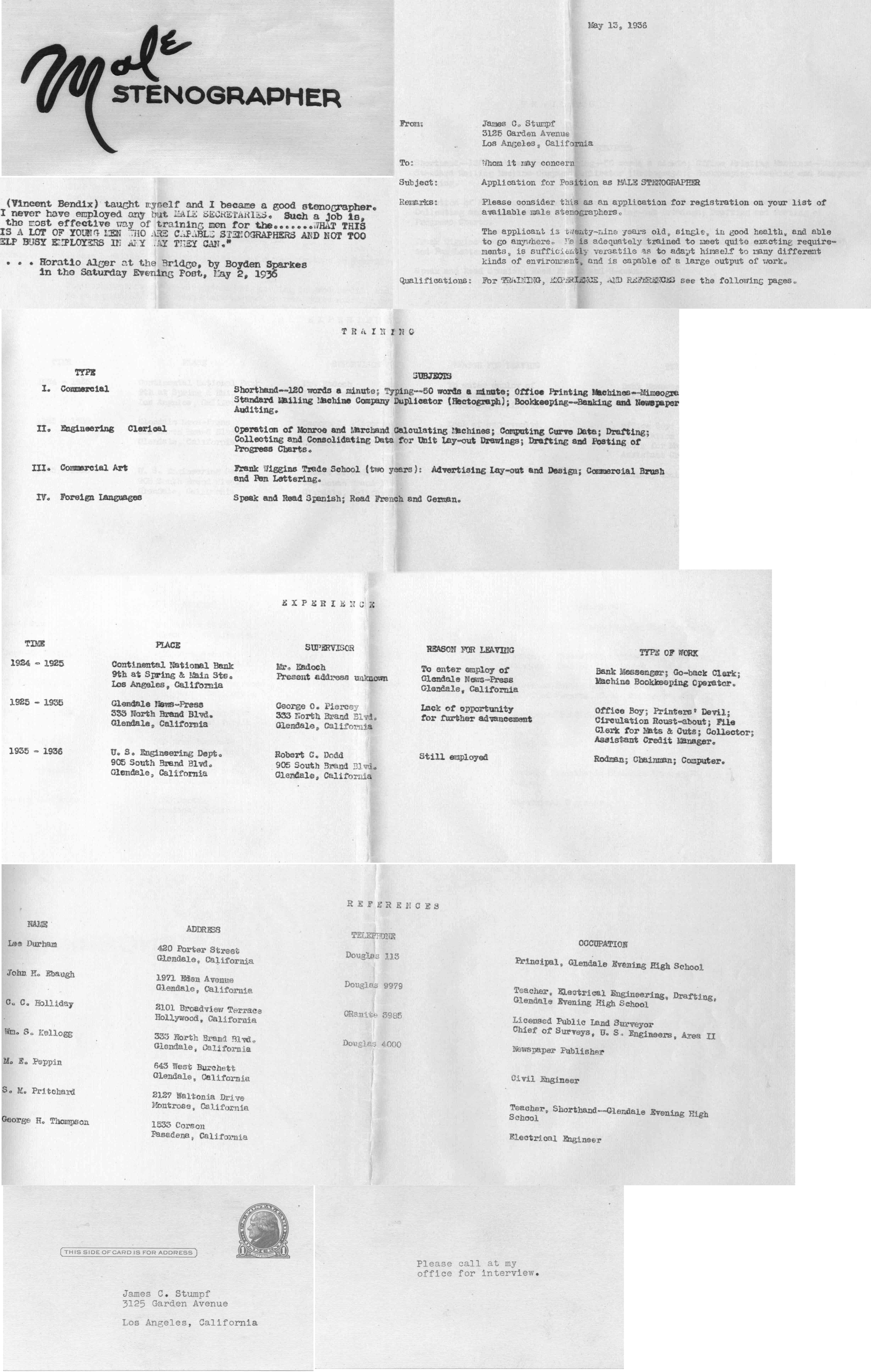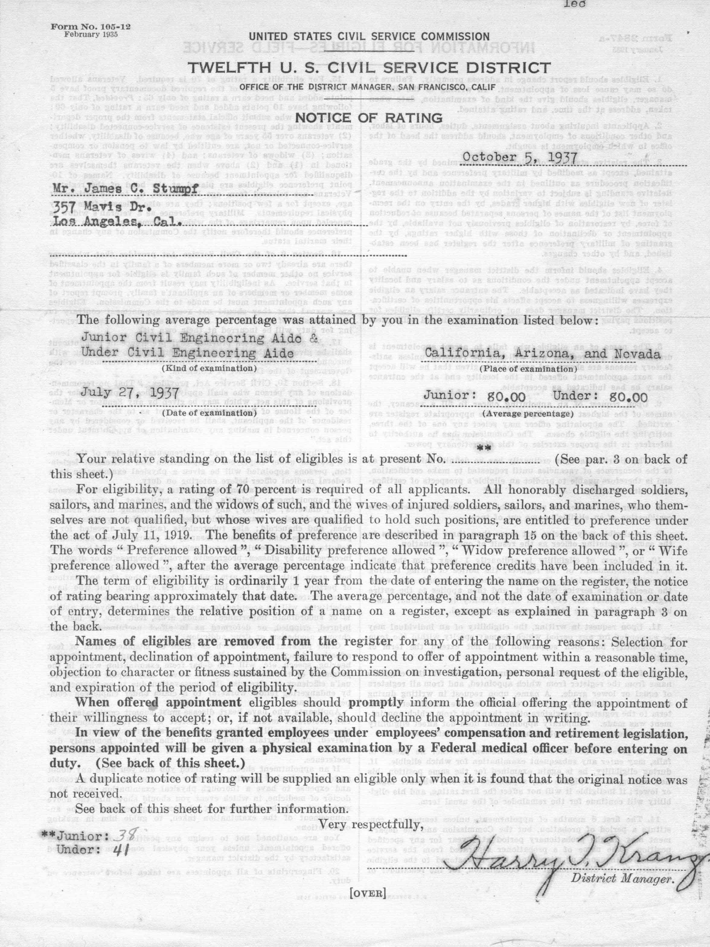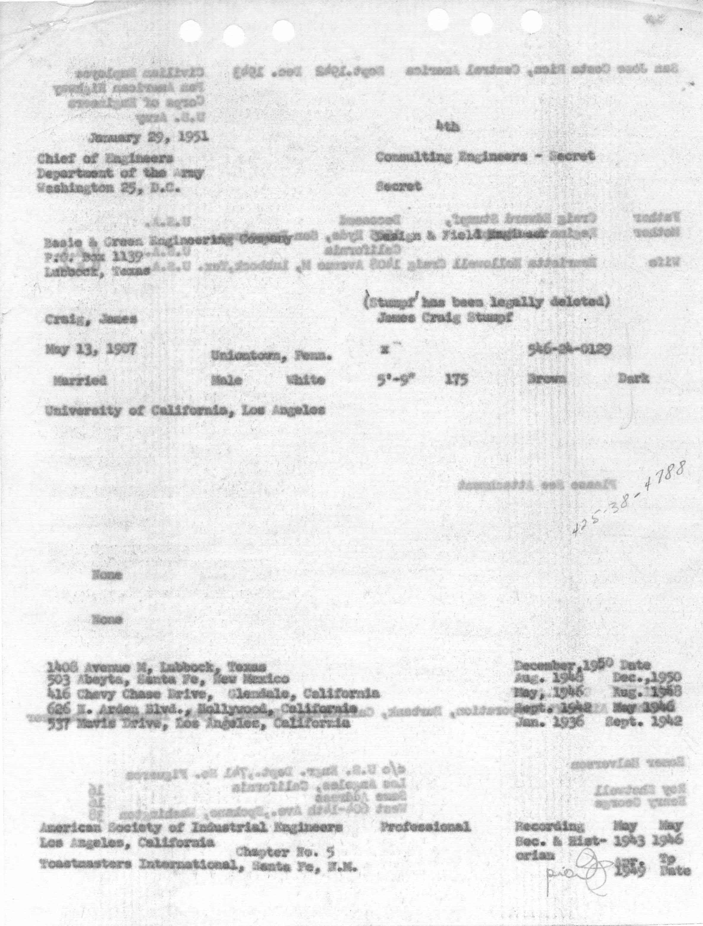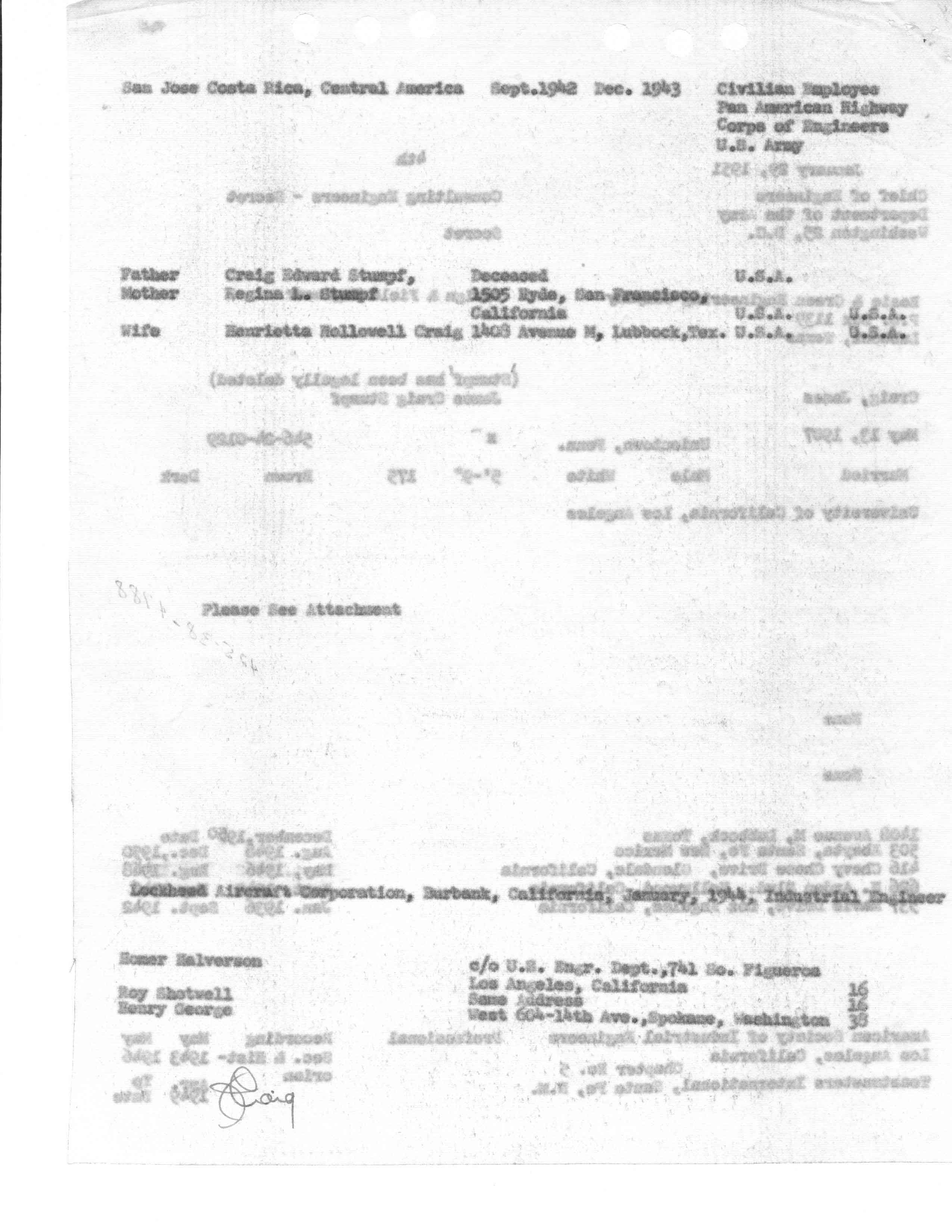 Jimmy was born James Craig Stumpf on May 13, 1907 in Uniontown, PA. It appears that his grandfather, John Rowe Stumpf had bought land in Lodi in 1907 with the intention of moving out here to grow grapes, but never did. In 1914, Jimmy’s immediate family of three -- himself, his mother Rachel Louise (Babinger) Stumpf, and his father Craig Edgar Stumpf – moved from Uniontown, PA to Lodi, CA, and then in August of 1923 made a second move to Glendale, CA, where Jimmy spent his senior year at Glendale High School. The moves were apparently prompted by Craig Edgar’s asthma, who had gone to Glendale earlier (in February of 1923) to look at the weather before moving the family there between Jimmy’s junior and senior years in high school. Unfortunately, Craig Edgar died in 1924, only a year after their move to Glendale, forcing Jimmy to withdraw his application to Stanford University. Jimmy lived with and supported his mother Rachel in the Glendale area for the next 14 years (until 1937), during several of which he delivered newspapers on his Indian motorcycle. Sometime between 1936 and 1937, Jimmy married Tedi (Henrietta Halliwell Strashun) and in January of 1937 they bought a house at 357 Mavis Drive in Glendale, CA. A good summary of Jimmy's educational experience is found under Jimmy Security Questionnaire below, and a good summary of his work experience is found under Work History and Work Experience.