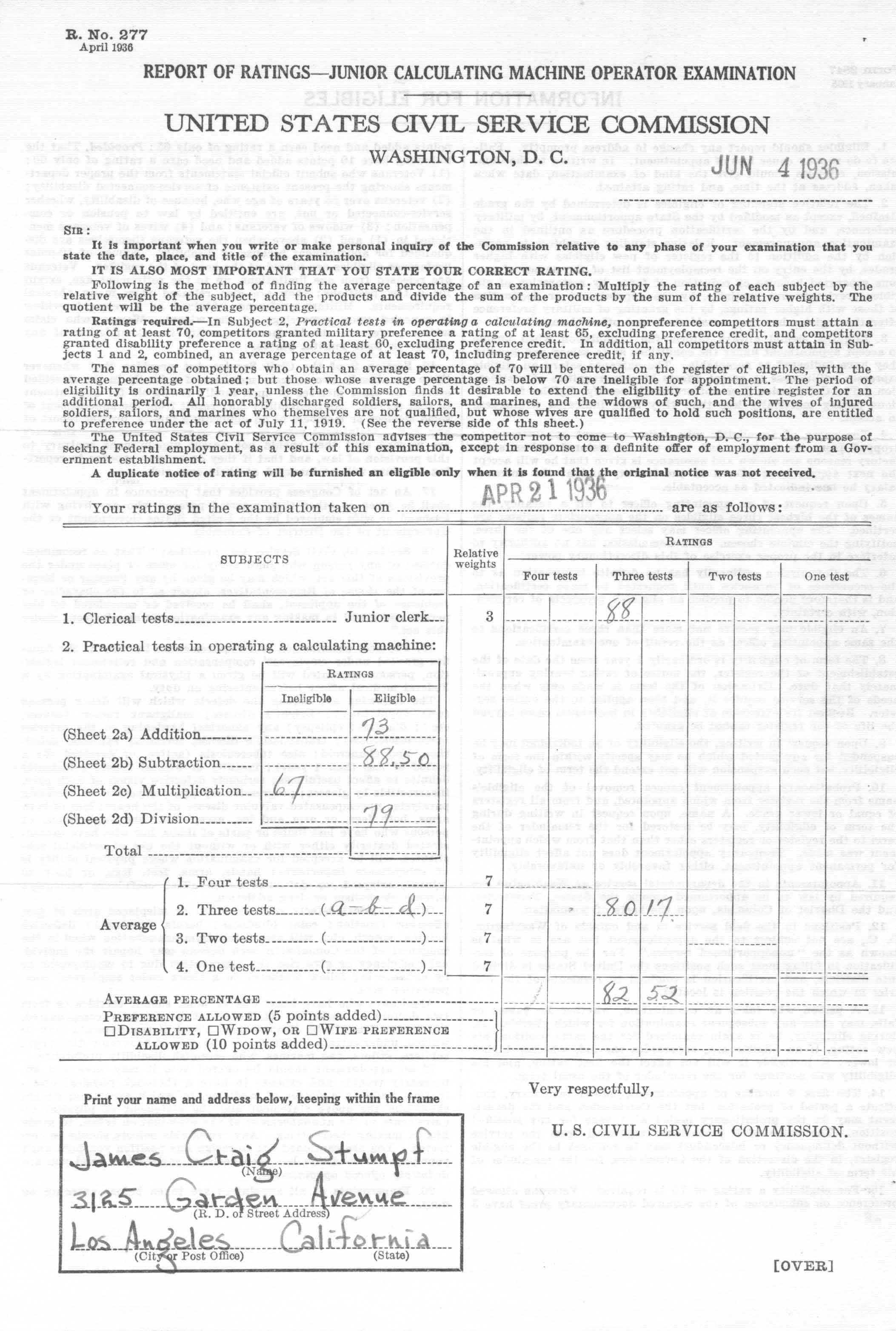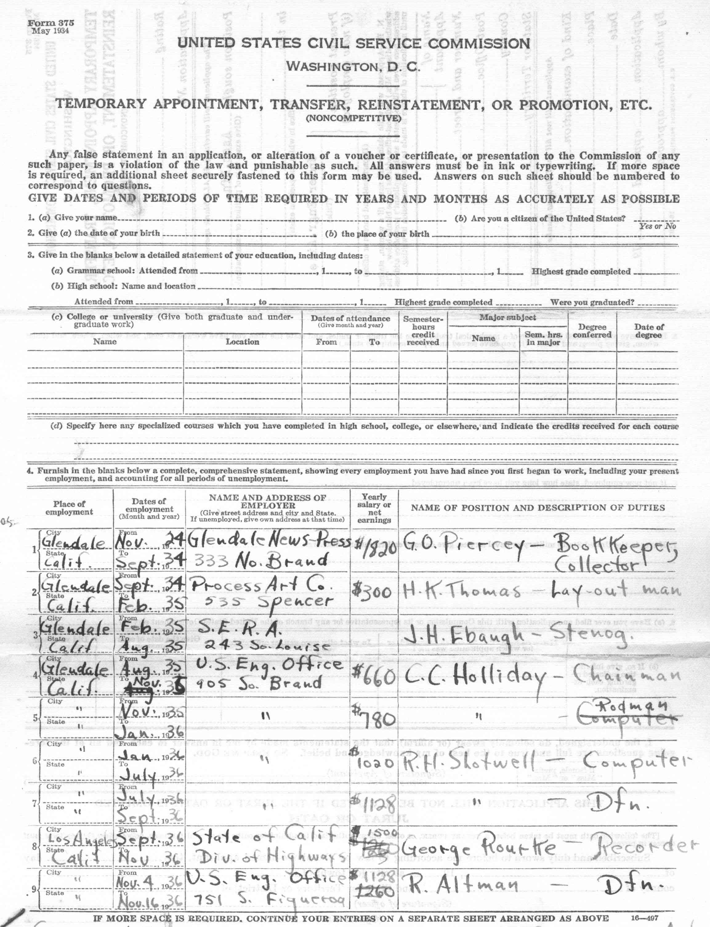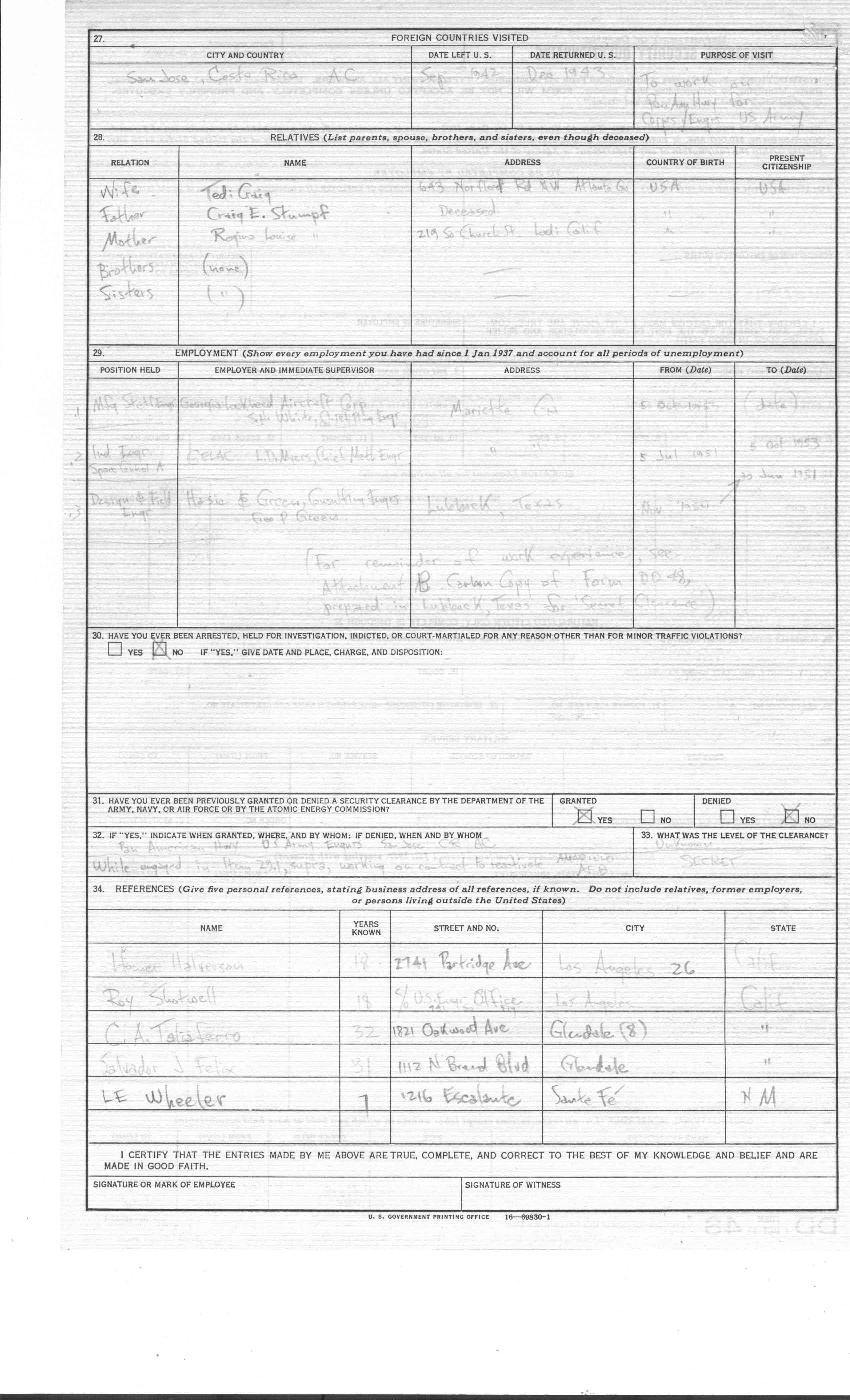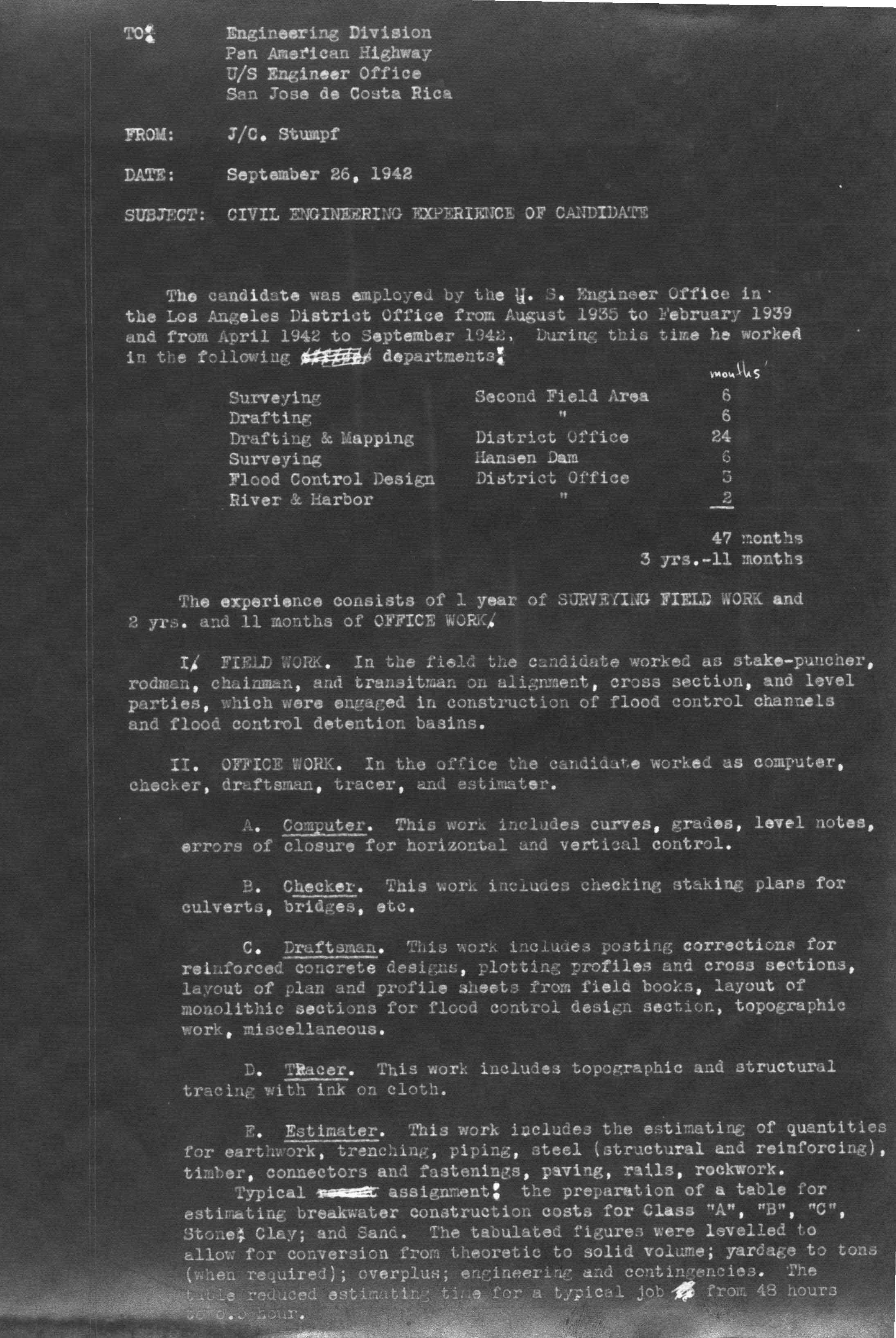 Jimmy was born James Craig Stumpf on May 13, 1907 in Uniontown, PA. It appears that his grandfather, John Rowe Stumpf had bought land in Lodi in 1907 with the intention of moving out here to grow grapes, but never did. In 1914, Jimmy’s immediate family of three -- himself, his mother Rachel Louise (Babinger) Stumpf, and his father Craig Edgar Stumpf – moved from Uniontown, PA to Lodi, CA, and then in August of 1923 made a second move to Glendale, CA, where Jimmy spent his senior year at Glendale High School. The moves were apparently prompted by Craig Edgar’s asthma, who had gone to Glendale earlier (in February of 1923) to look at the weather before moving the family there between Jimmy’s junior and senior years in high school. Unfortunately, Craig Edgar died in 1924, only a year after their move to Glendale, forcing Jimmy to withdraw his application to Stanford University. Jimmy lived with and supported his mother Rachel in the Glendale area for the next 14 years (until 1937), during several of which he delivered newspapers on his Indian motorcycle. Sometime between 1936 and 1937, Jimmy married Tedi (Henrietta Halliwell Strashun) and in January of 1937 they bought a house at 357 Mavis Drive in Glendale, CA. A good summary of Jimmy's educational experience is found under Jimmy Security Questionnaire below, and a good summary of his work experience is found under Work History and Work Experience.