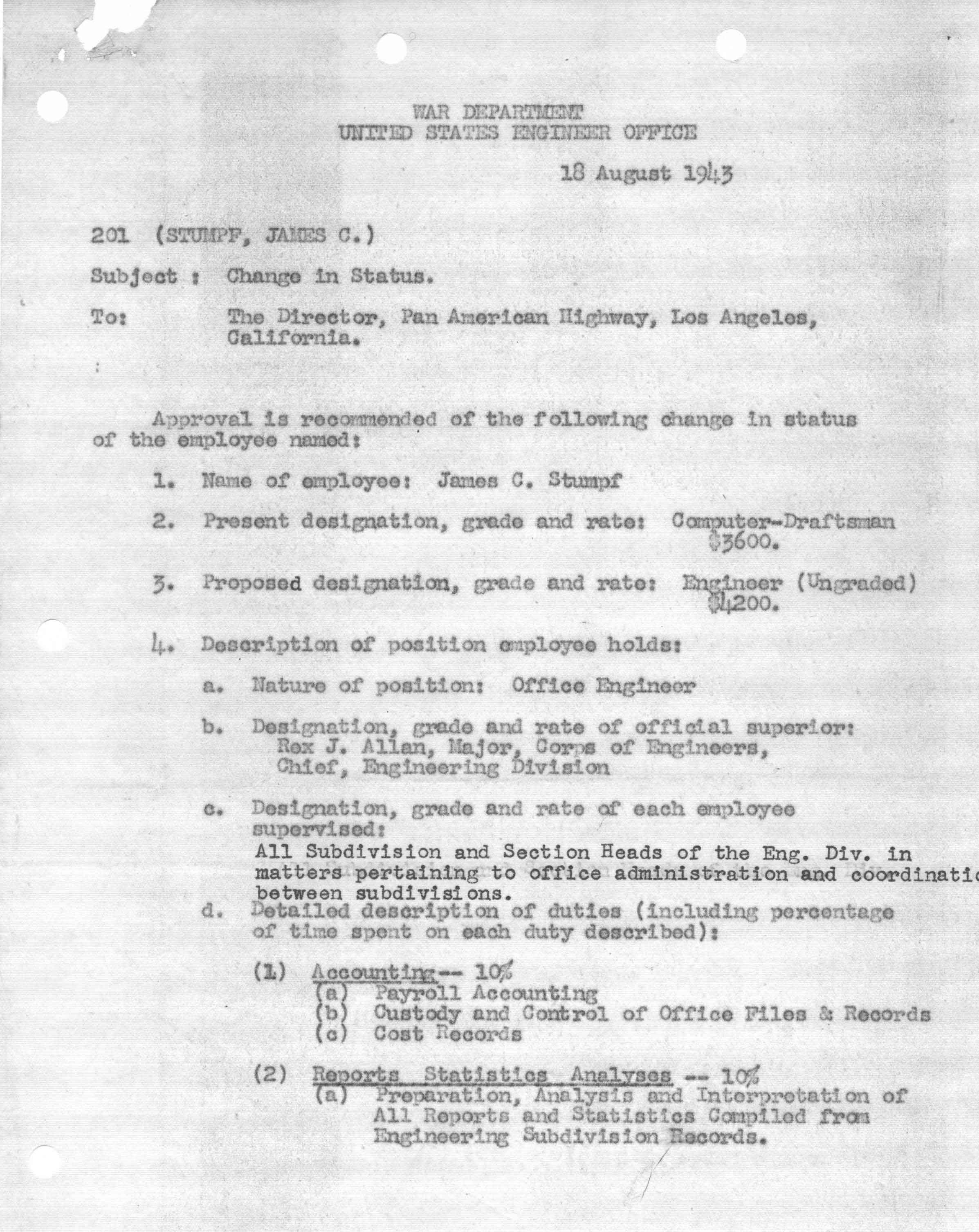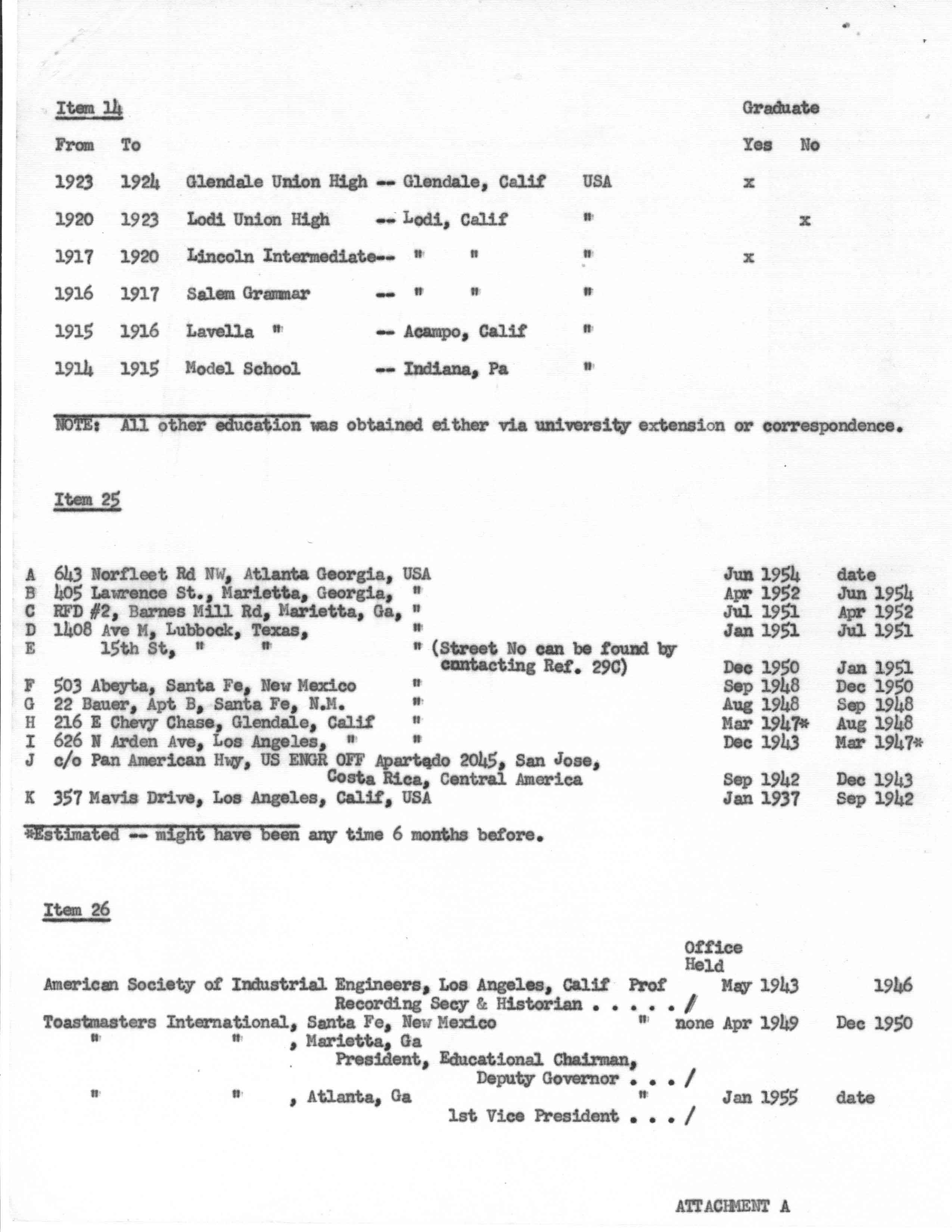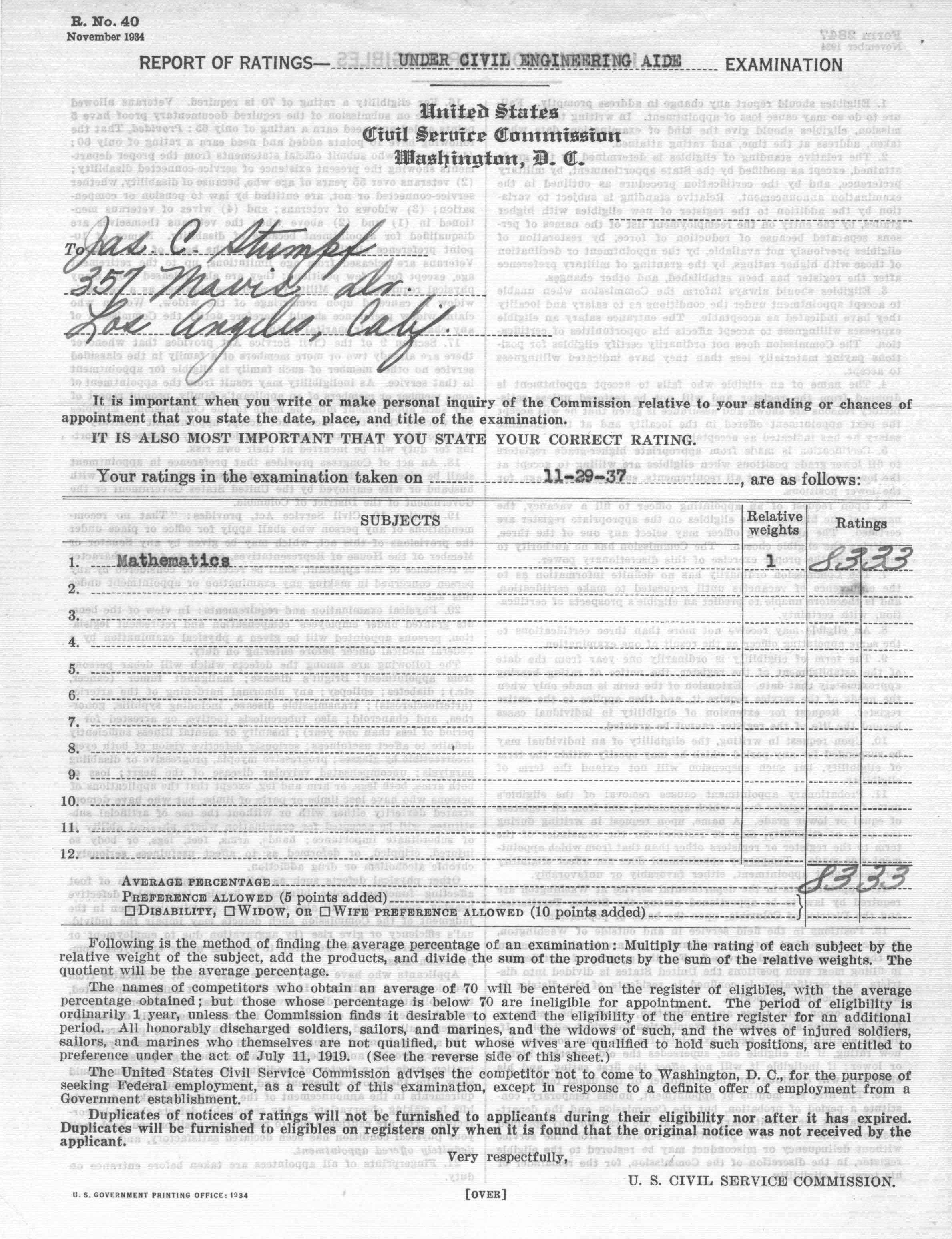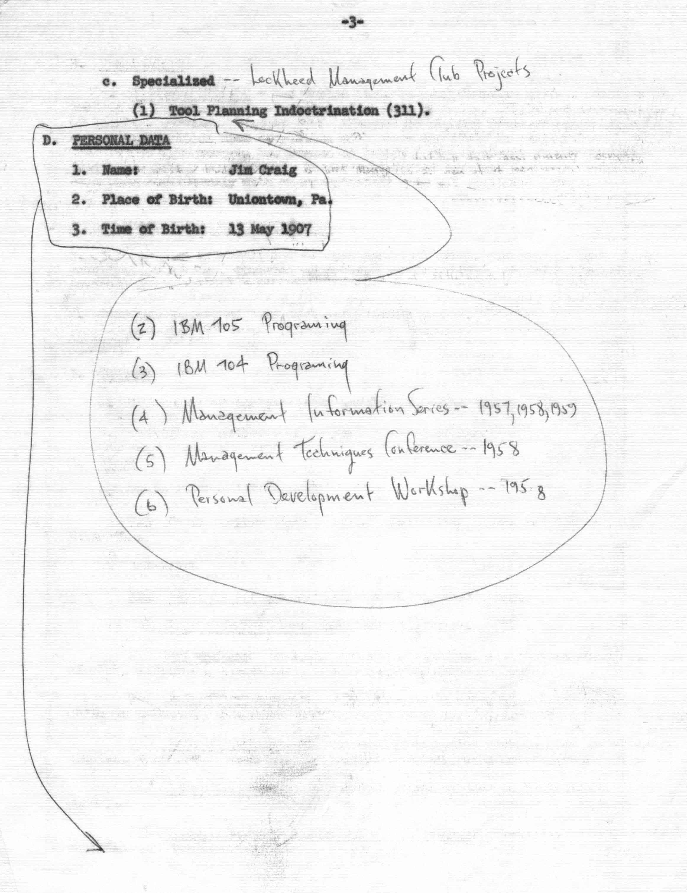 Jimmy was born James Craig Stumpf on May 13, 1907 in Uniontown, PA. It appears that his grandfather, John Rowe Stumpf had bought land in Lodi in 1907 with the intention of moving out here to grow grapes, but never did. In 1914, Jimmy’s immediate family of three -- himself, his mother Rachel Louise (Babinger) Stumpf, and his father Craig Edgar Stumpf – moved from Uniontown, PA to Lodi, CA, and then in August of 1923 made a second move to Glendale, CA, where Jimmy spent his senior year at Glendale High School. The moves were apparently prompted by Craig Edgar’s asthma, who had gone to Glendale earlier (in February of 1923) to look at the weather before moving the family there between Jimmy’s junior and senior years in high school. Unfortunately, Craig Edgar died in 1924, only a year after their move to Glendale, forcing Jimmy to withdraw his application to Stanford University. Jimmy lived with and supported his mother Rachel in the Glendale area for the next 14 years (until 1937), during several of which he delivered newspapers on his Indian motorcycle. Sometime between 1936 and 1937, Jimmy married Tedi (Henrietta Halliwell Strashun) and in January of 1937 they bought a house at 357 Mavis Drive in Glendale, CA. A good summary of Jimmy's educational experience is found under Jimmy Security Questionnaire below, and a good summary of his work experience is found under Work History and Work Experience.