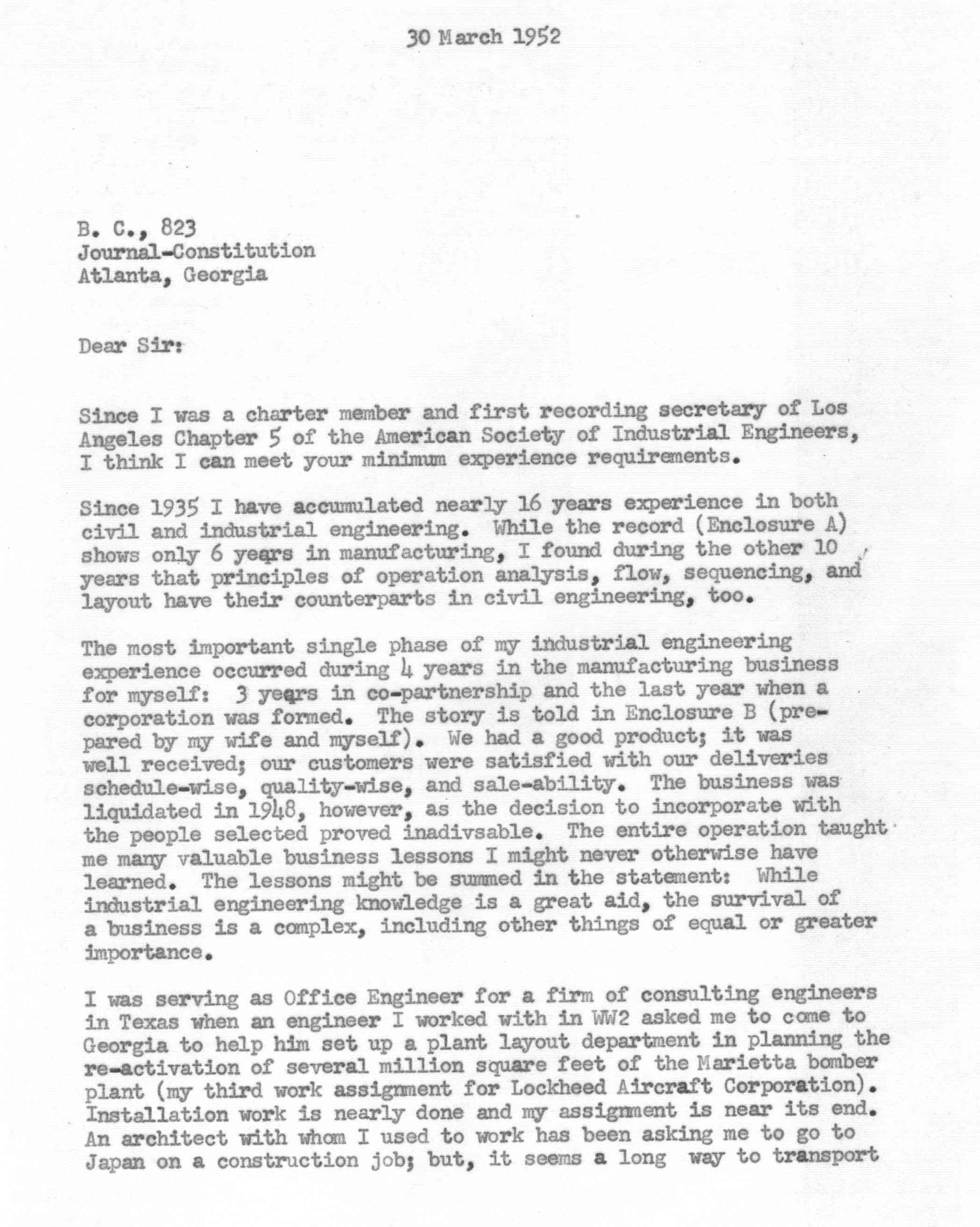 03/30/1952 -- Job Application to Atlanta Journal    1