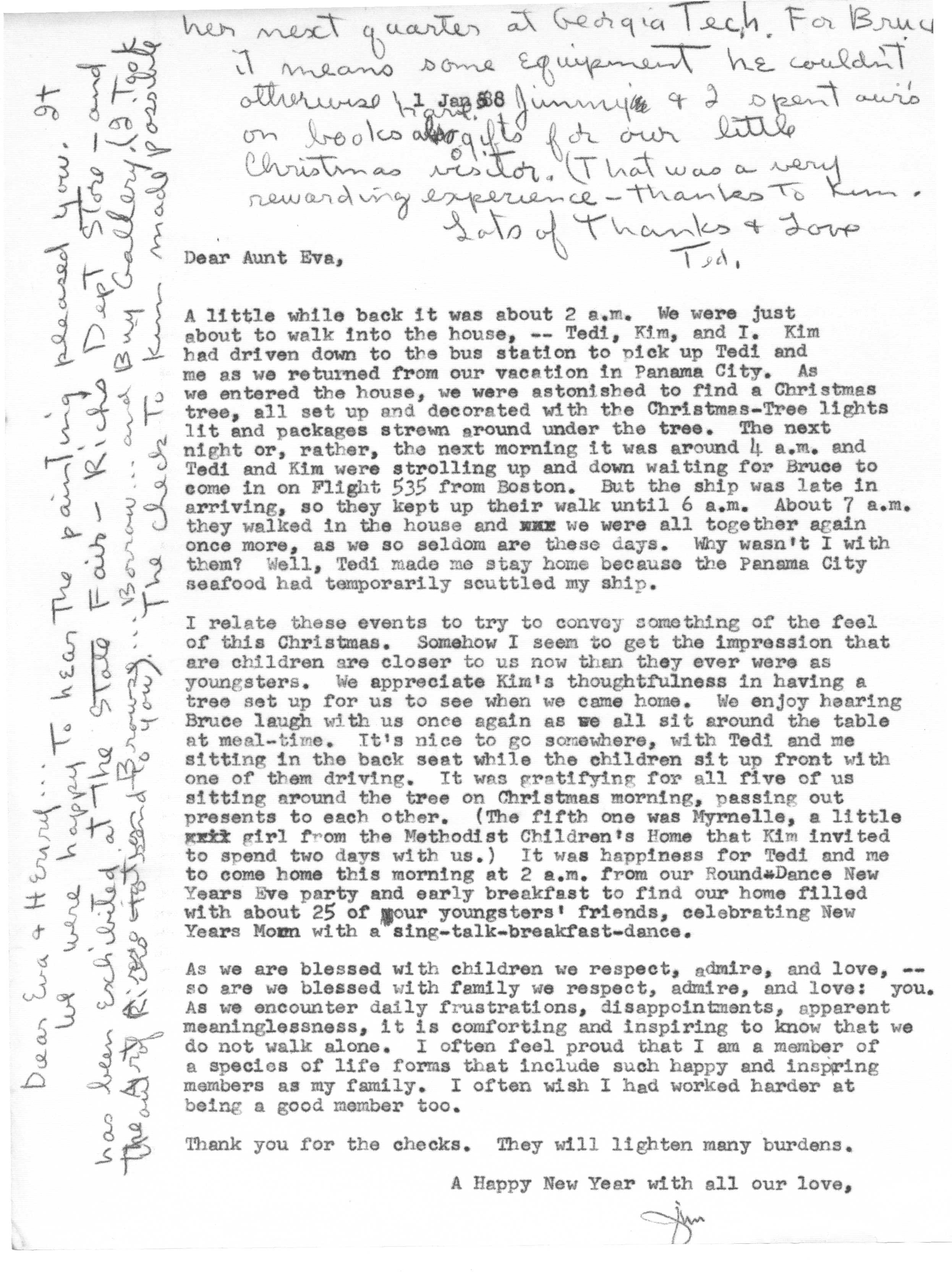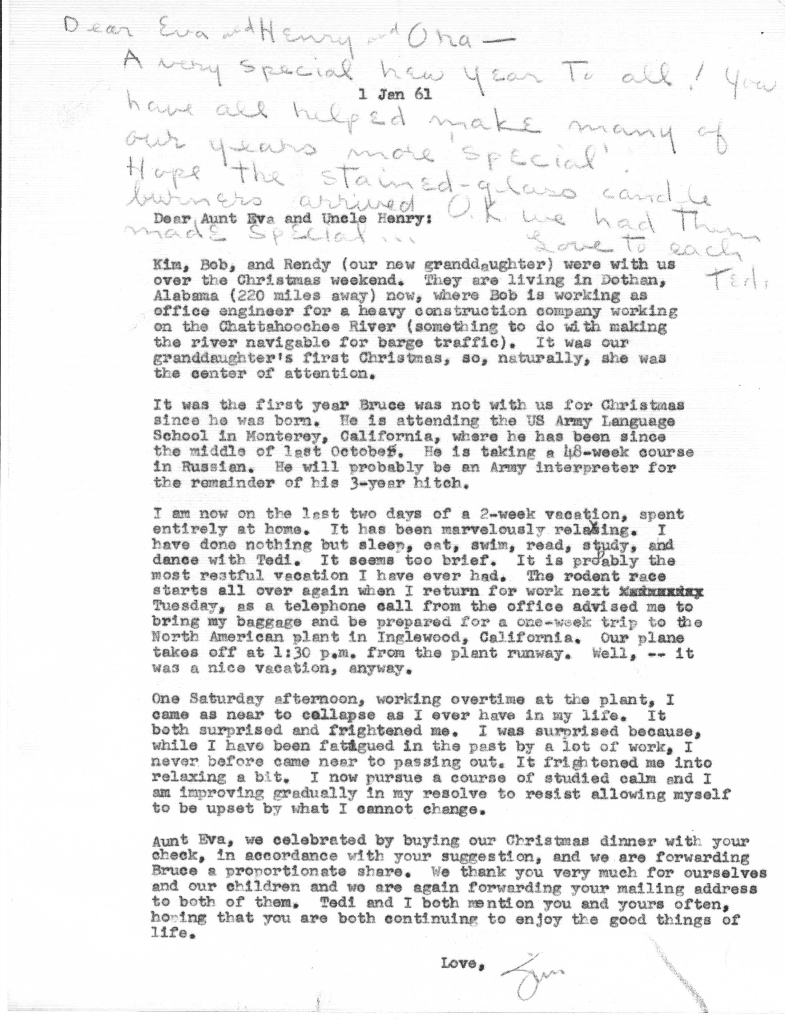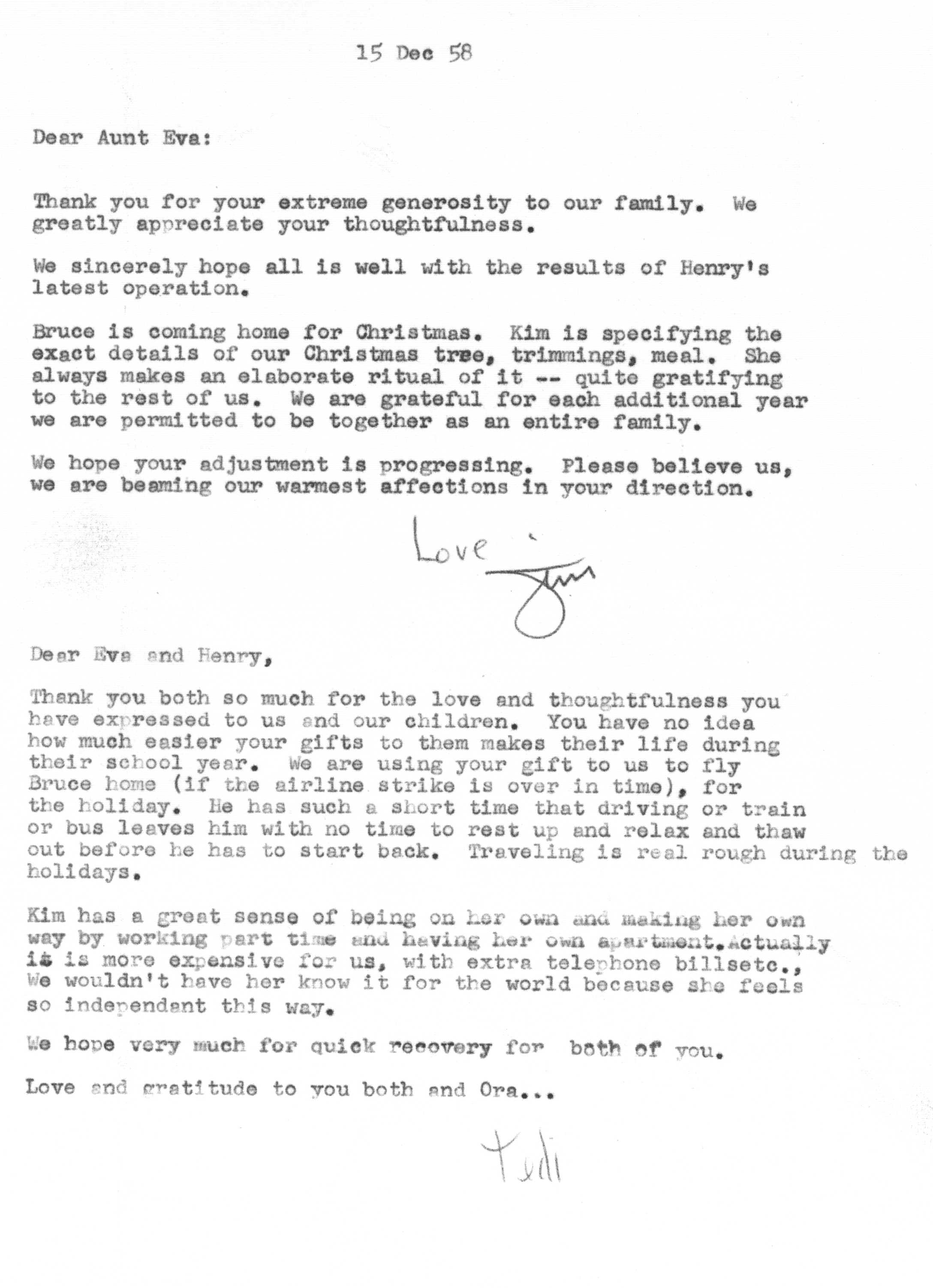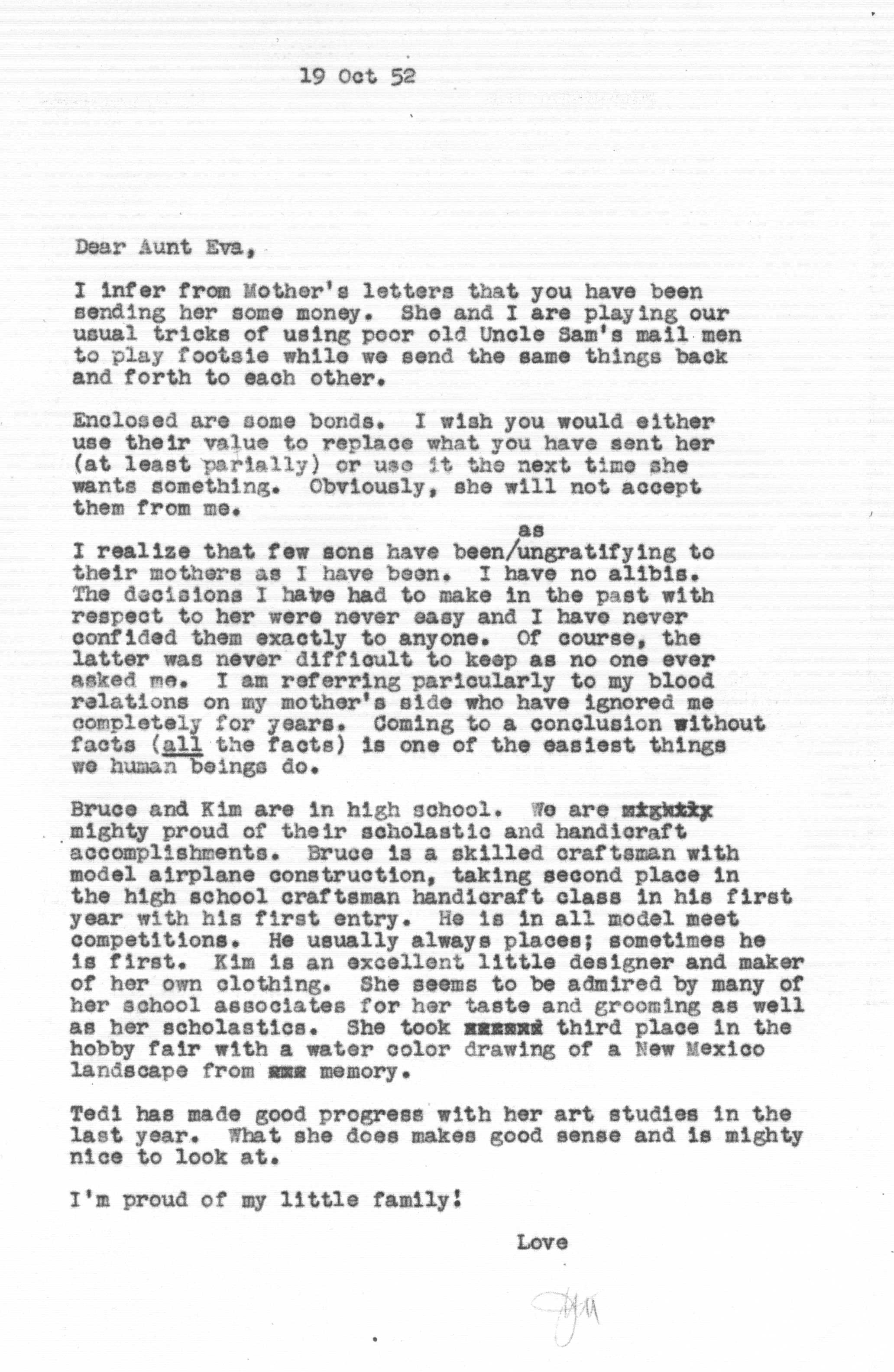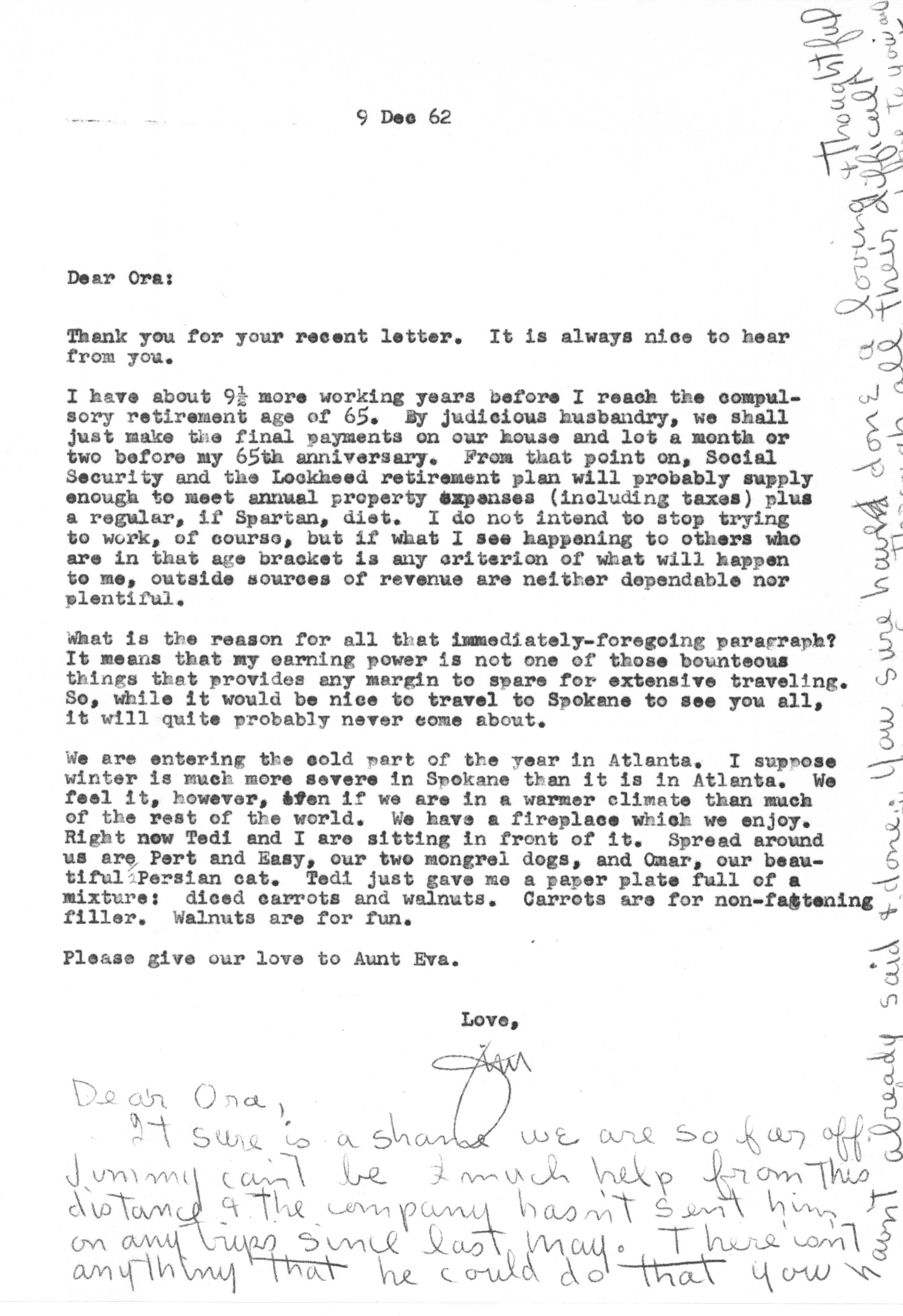 Because of Jimmy's care in keeping a carbon copy of each letter he wrote, we have a fairly detailed history of Tedi and Jimmy's moods and movements from 1942 to 1963 through the letters he exchanged with his Aunt Eva George (nee Eva Gwendoline Stumpf, a sister of Jimmy's father Craig Edgar Stumpf). Apparently, Craig had helped Eva attend the University of Michigan in Ann Arbor, where she met and married Henry George, and Eva tried to repay his kindness by supplying continuing financial assistance throughout the period 1944-1963 and perhaps even before. A name which arises frequently in the Henry/Eva George chronology is that of Ora Enterline, a member of the Stumpf family somewhat removed and who never married, but who was close to Eva as a companion throughout her life, who also lived with Jim's Aunt Violet in Alturas, Florida during part of the year, and who also was of great assistance to the Strashun side of the family during their last days in Los Angeles in the late 1950s and early 1960s.. Dates of interest are -- Craig Edgar Stumpf (1870-1924), Eva Gwendoline Stumpf (George) (1887-1963), Henry George (1883-1962), and Ora Enterline (1892-?).