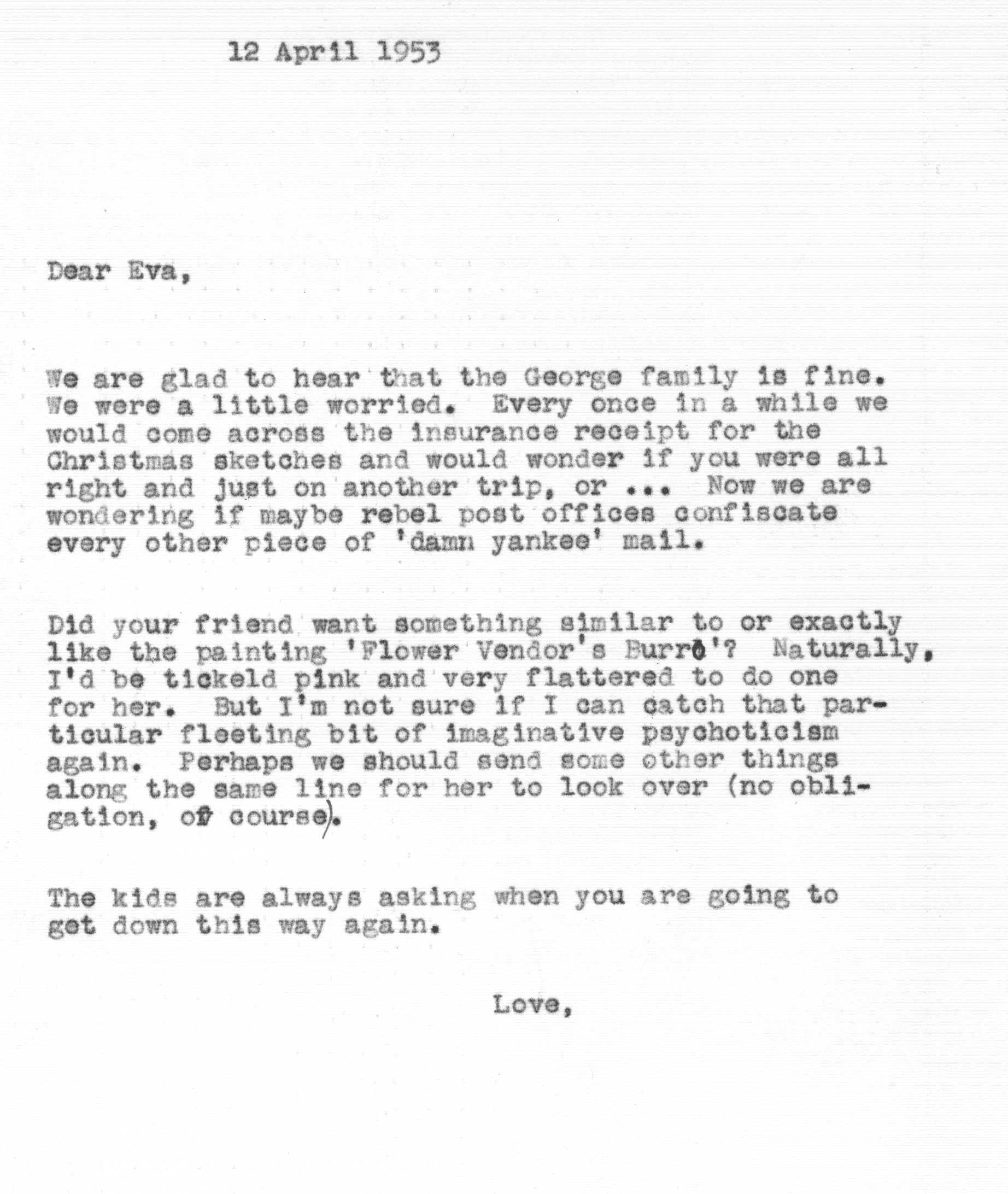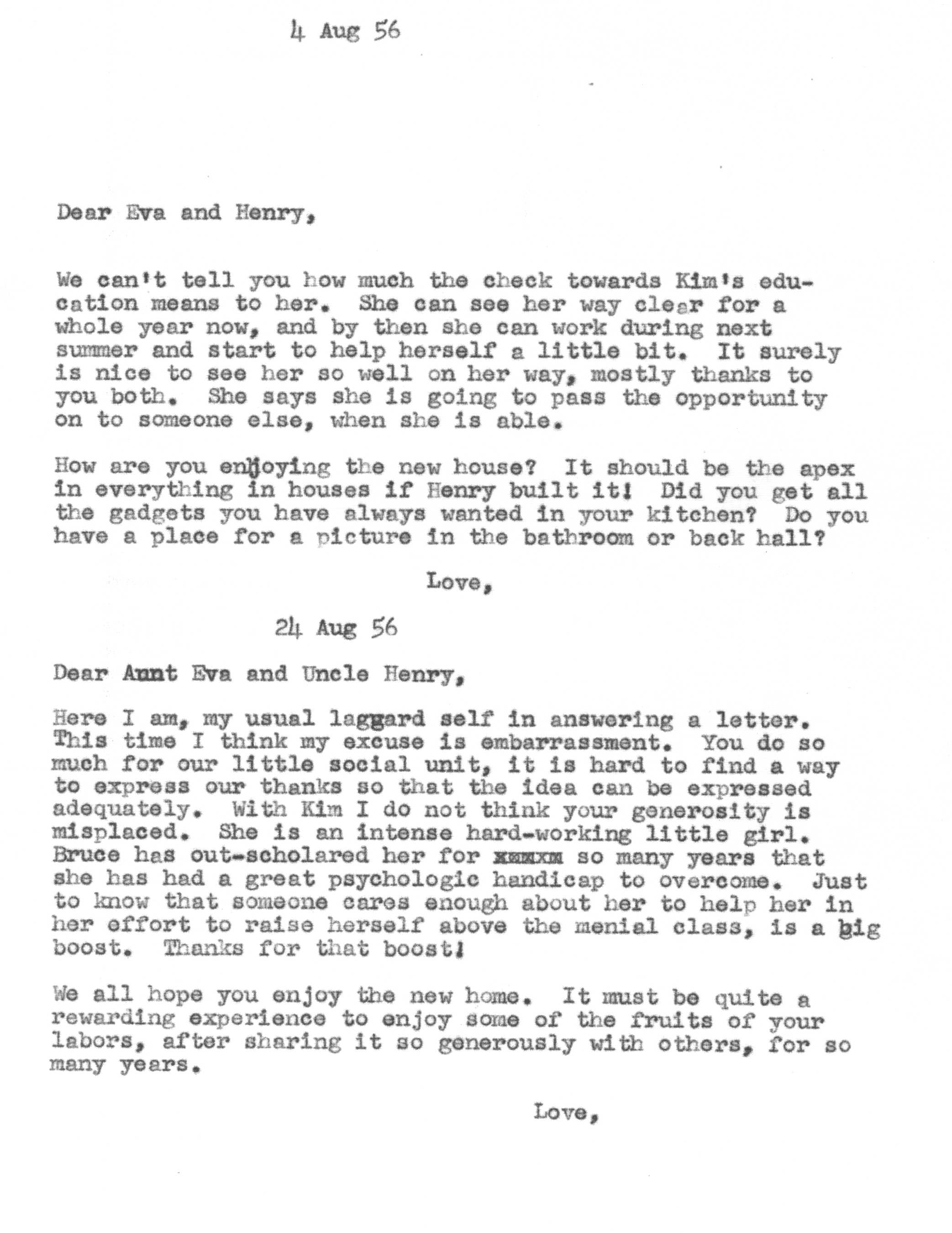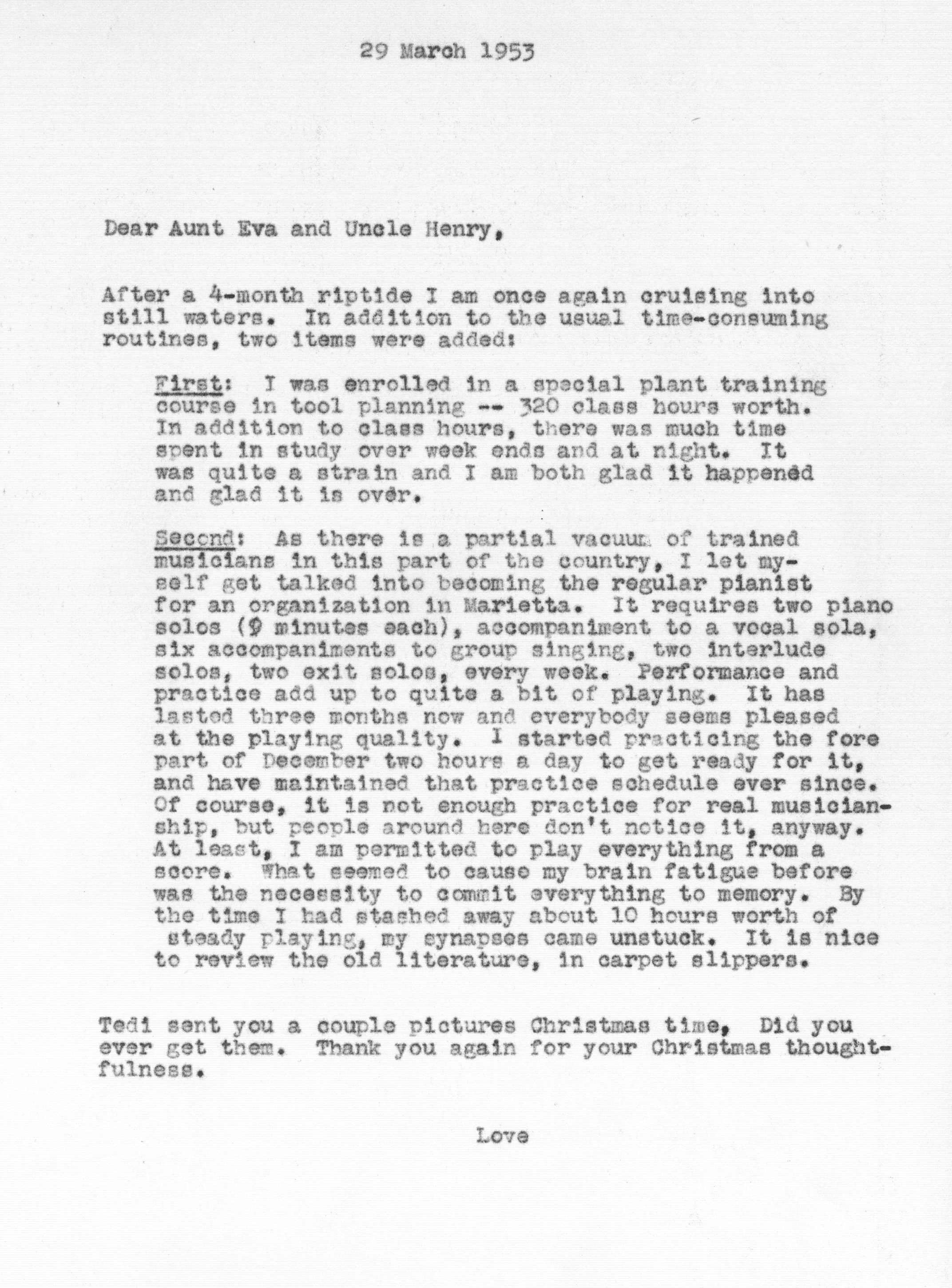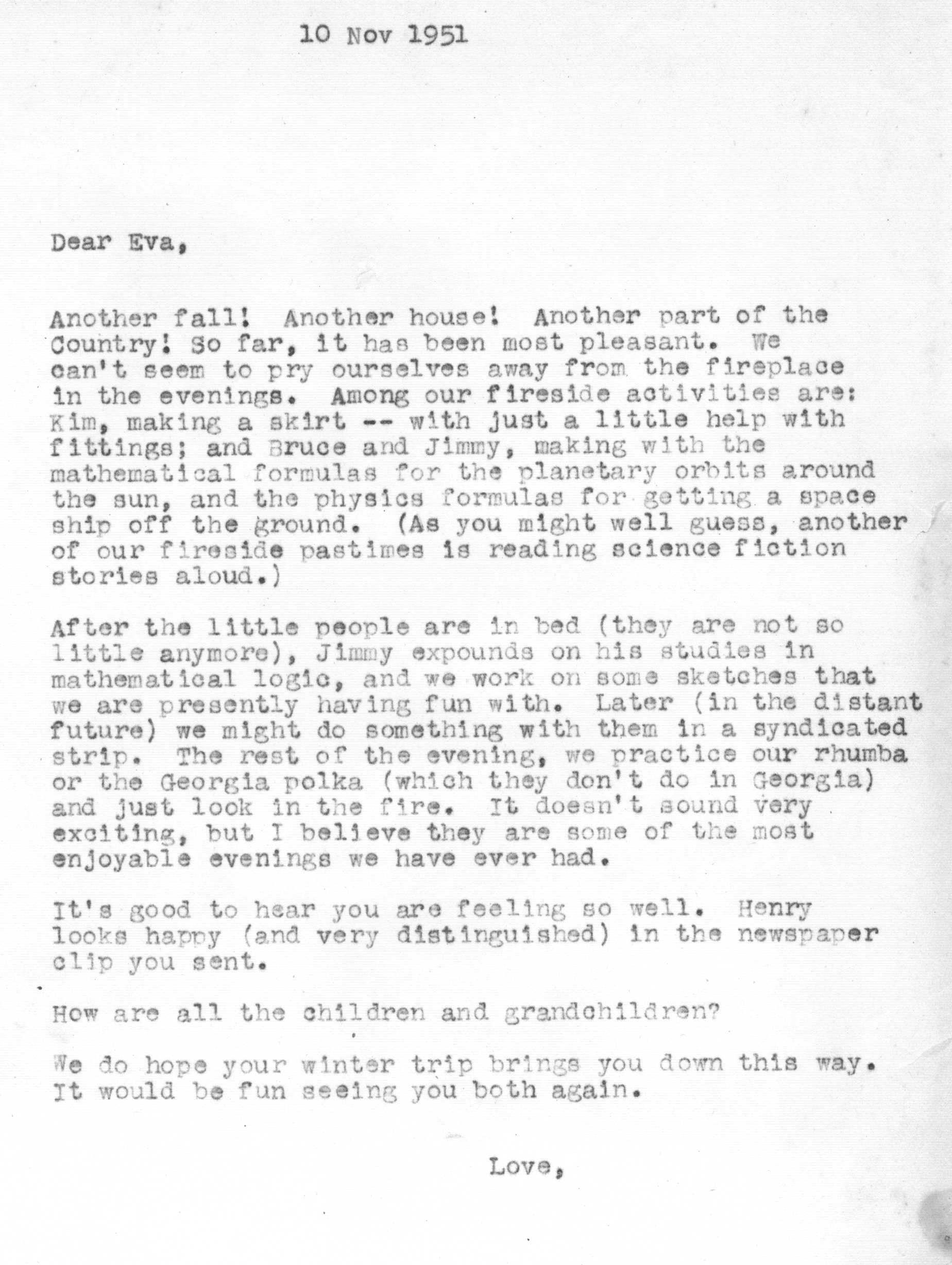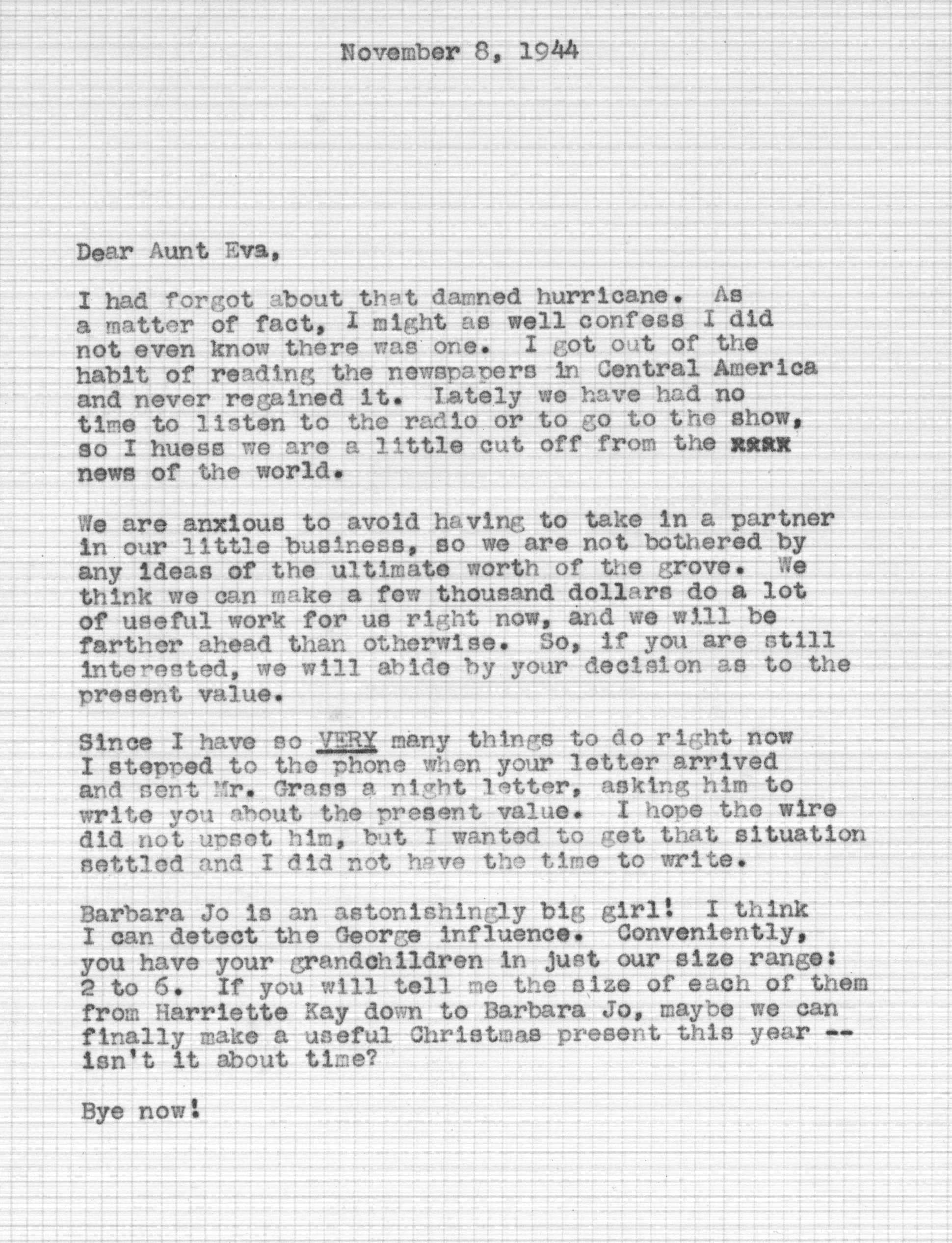 Because of Jimmy's care in keeping a carbon copy of each letter he wrote, we have a fairly detailed history of Tedi and Jimmy's moods and movements from 1942 to 1963 through the letters he exchanged with his Aunt Eva George (nee Eva Gwendoline Stumpf, a sister of Jimmy's father Craig Edgar Stumpf). Apparently, Craig had helped Eva attend the University of Michigan in Ann Arbor, where she met and married Henry George, and Eva tried to repay his kindness by supplying continuing financial assistance throughout the period 1944-1963 and perhaps even before. A name which arises frequently in the Henry/Eva George chronology is that of Ora Enterline, a member of the Stumpf family somewhat removed and who never married, but who was close to Eva as a companion throughout her life, who also lived with Jim's Aunt Violet in Alturas, Florida during part of the year, and who also was of great assistance to the Strashun side of the family during their last days in Los Angeles in the late 1950s and early 1960s.. Dates of interest are -- Craig Edgar Stumpf (1870-1924), Eva Gwendoline Stumpf (George) (1887-1963), Henry George (1883-1962), and Ora Enterline (1892-?).