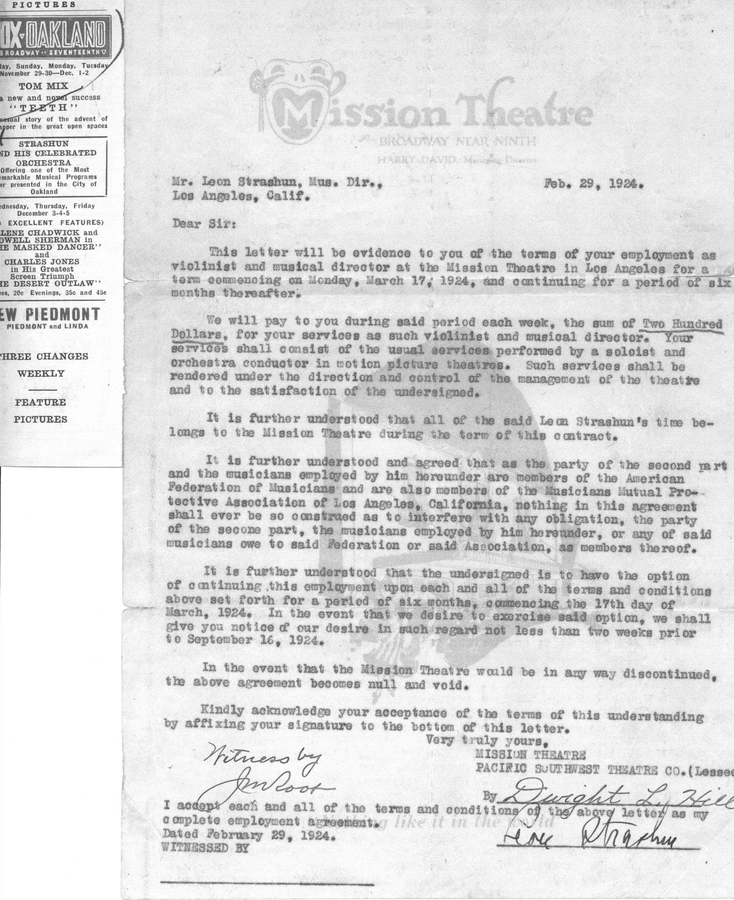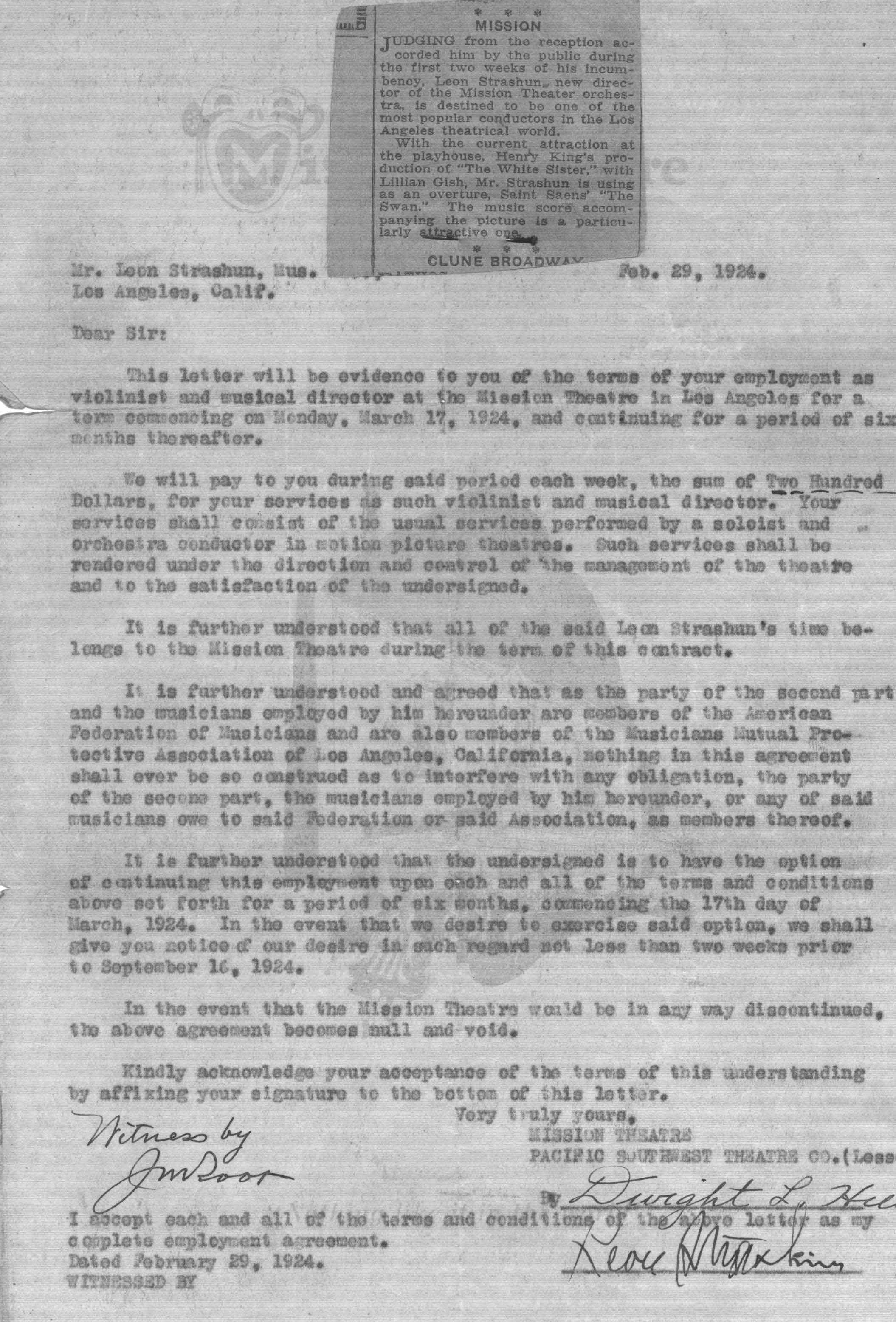 02/29/1924 -- Letter from Mission Theater in LA    1
