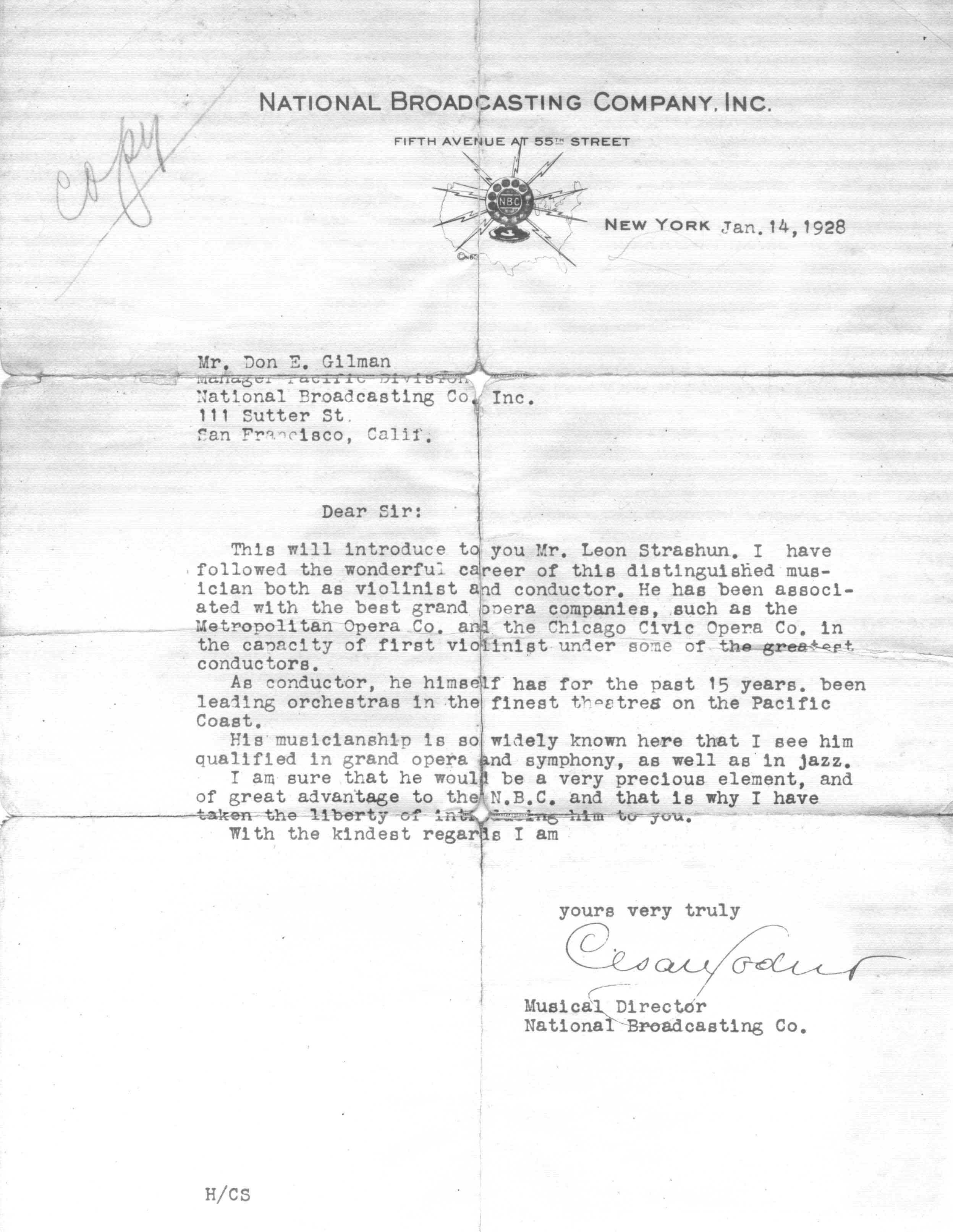01/14/1928 -- Letter from Cesar Sodero to Don. E. Gilman