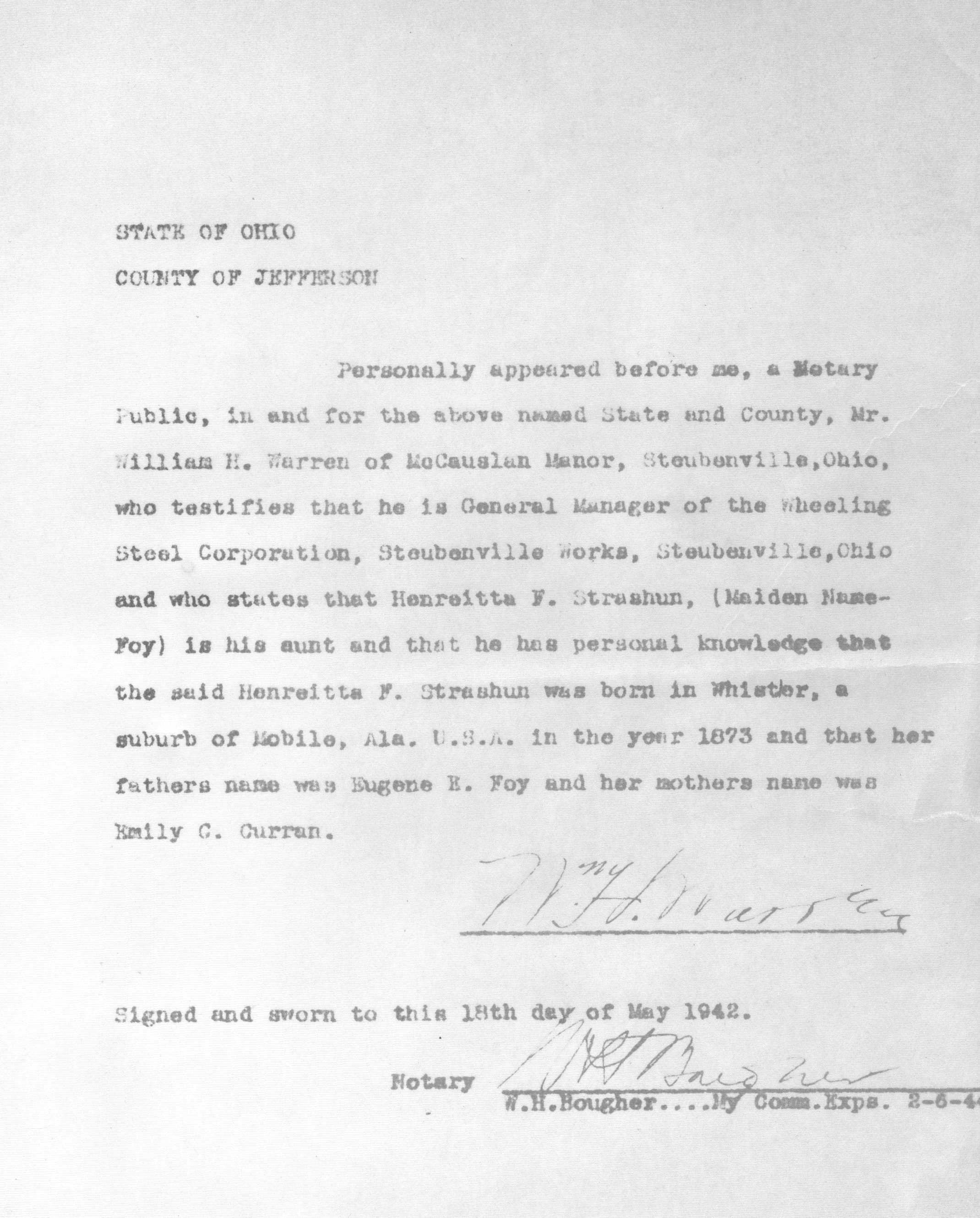 05/18/1942 -- Affidavit from William H. Warren to Henrietta