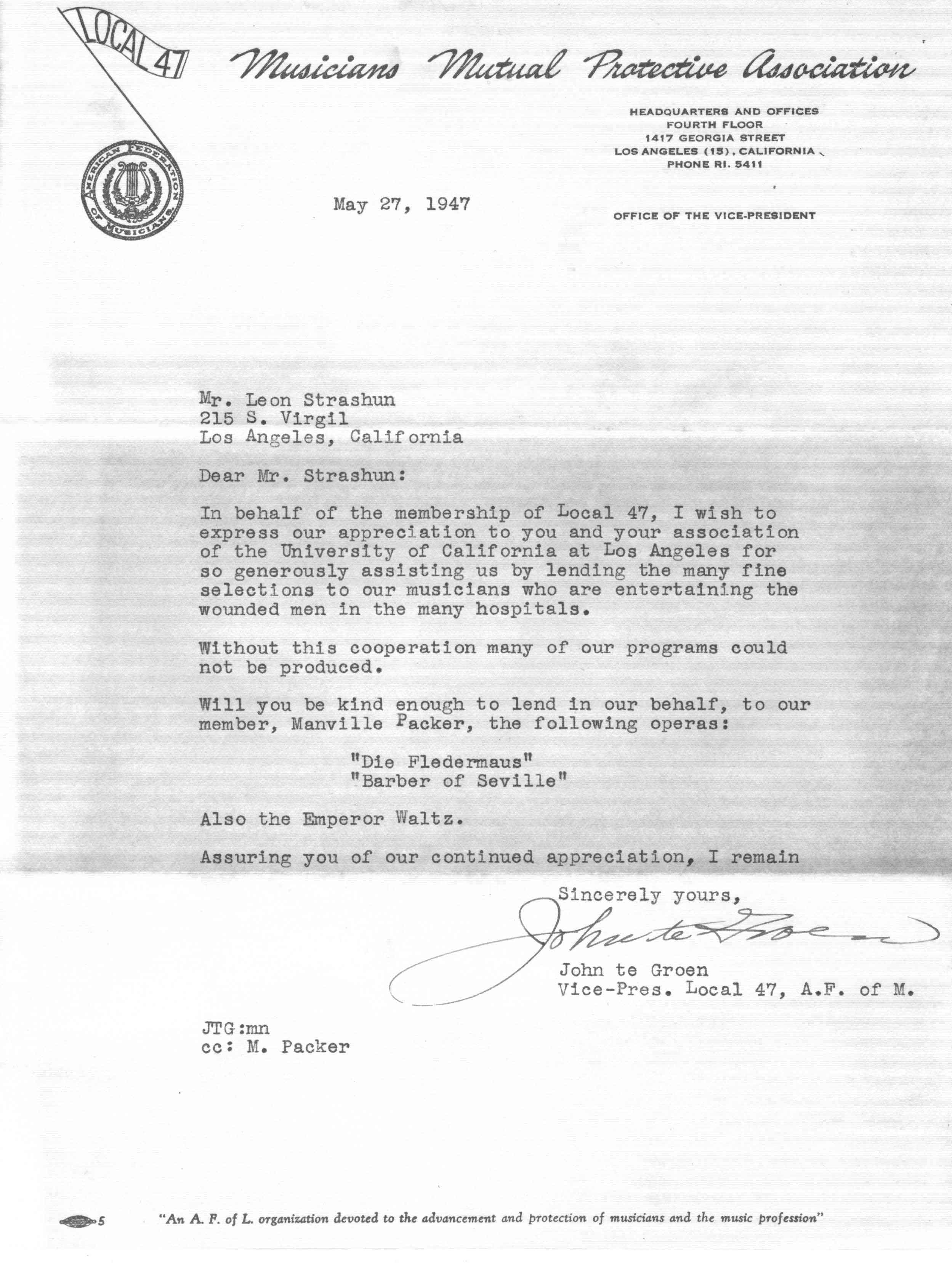 05/27/1947 -- Letter from John te Groen