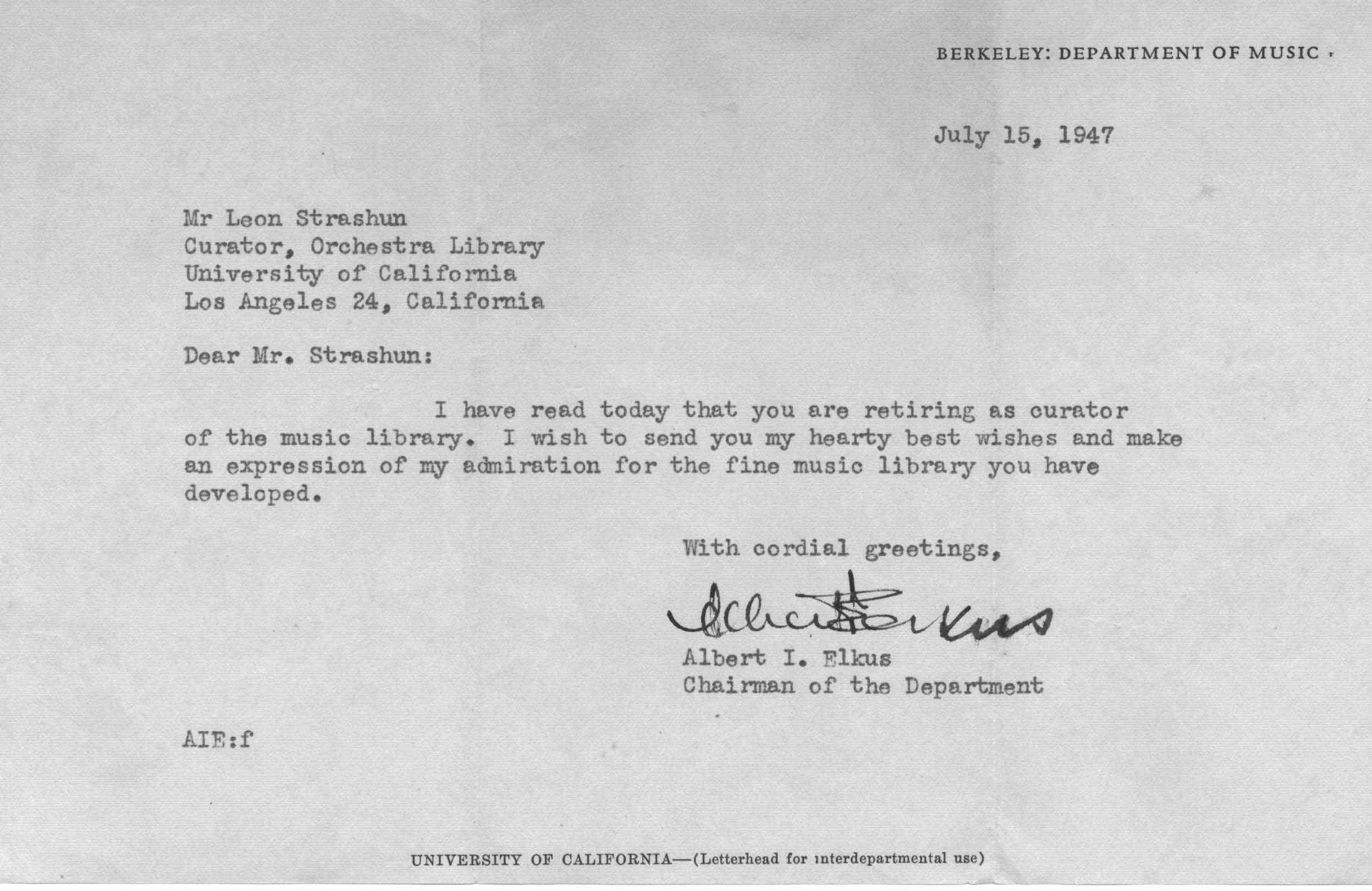 07/15/1947 -- Letter from Albert I. Elkus at UC Berkeley