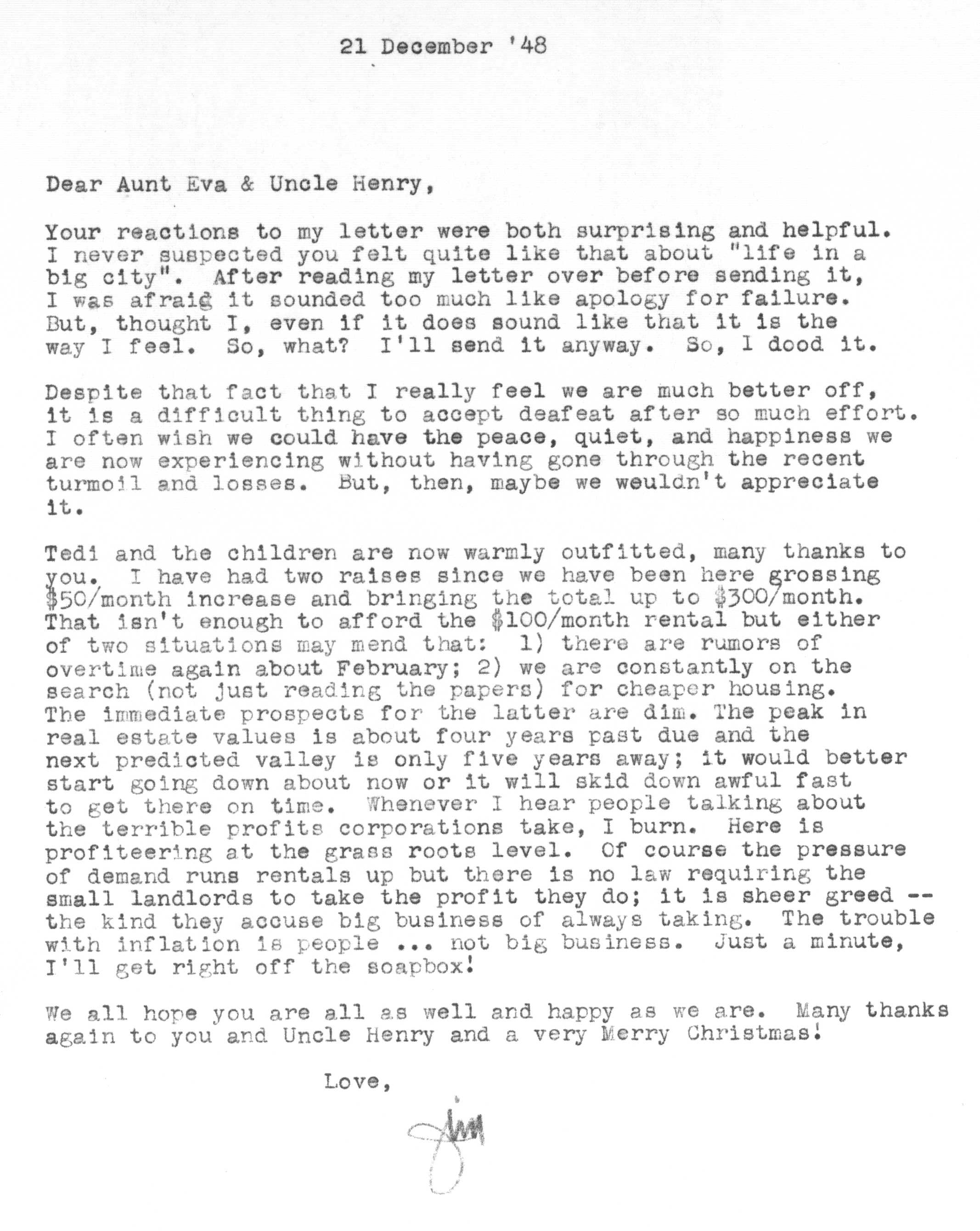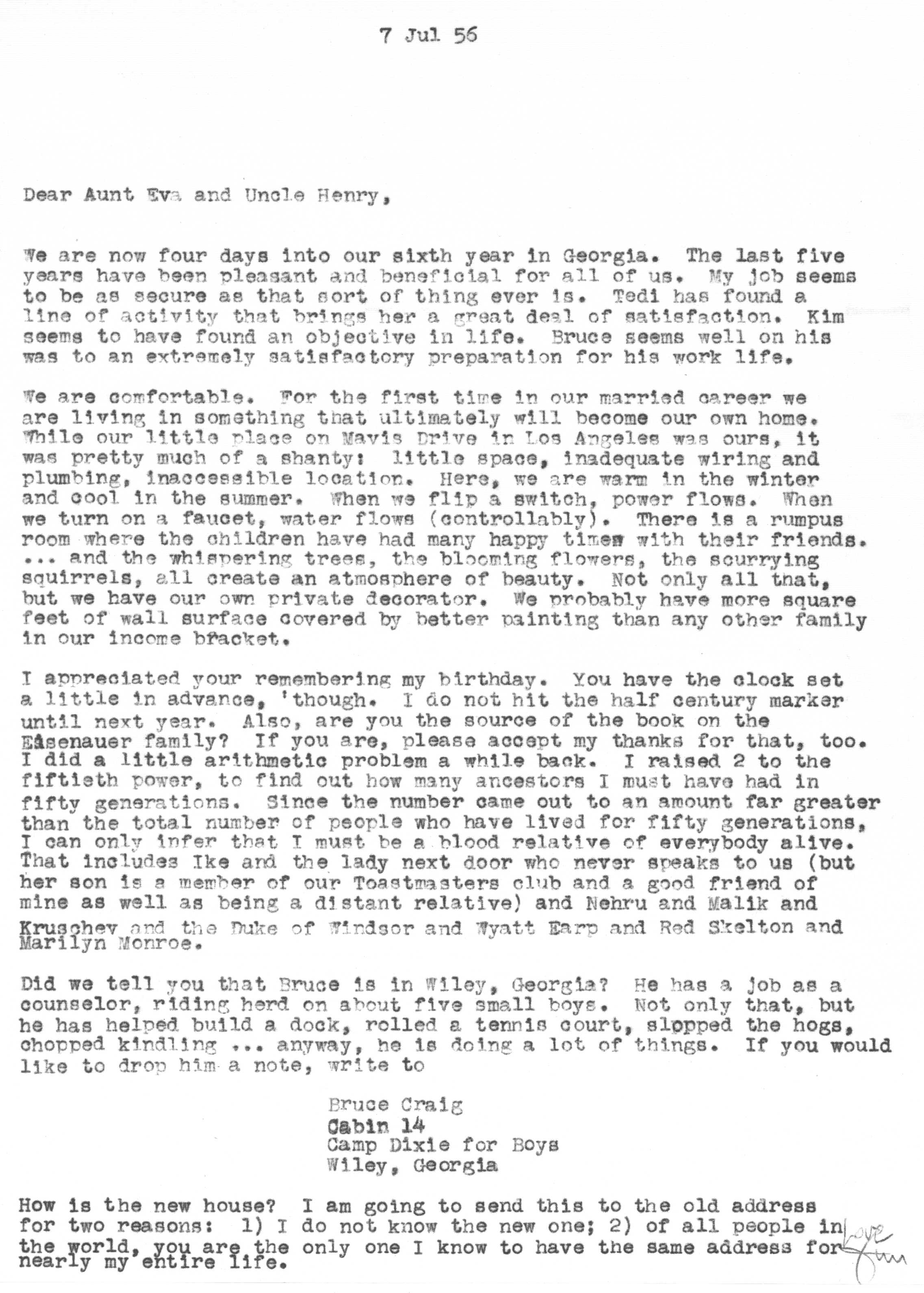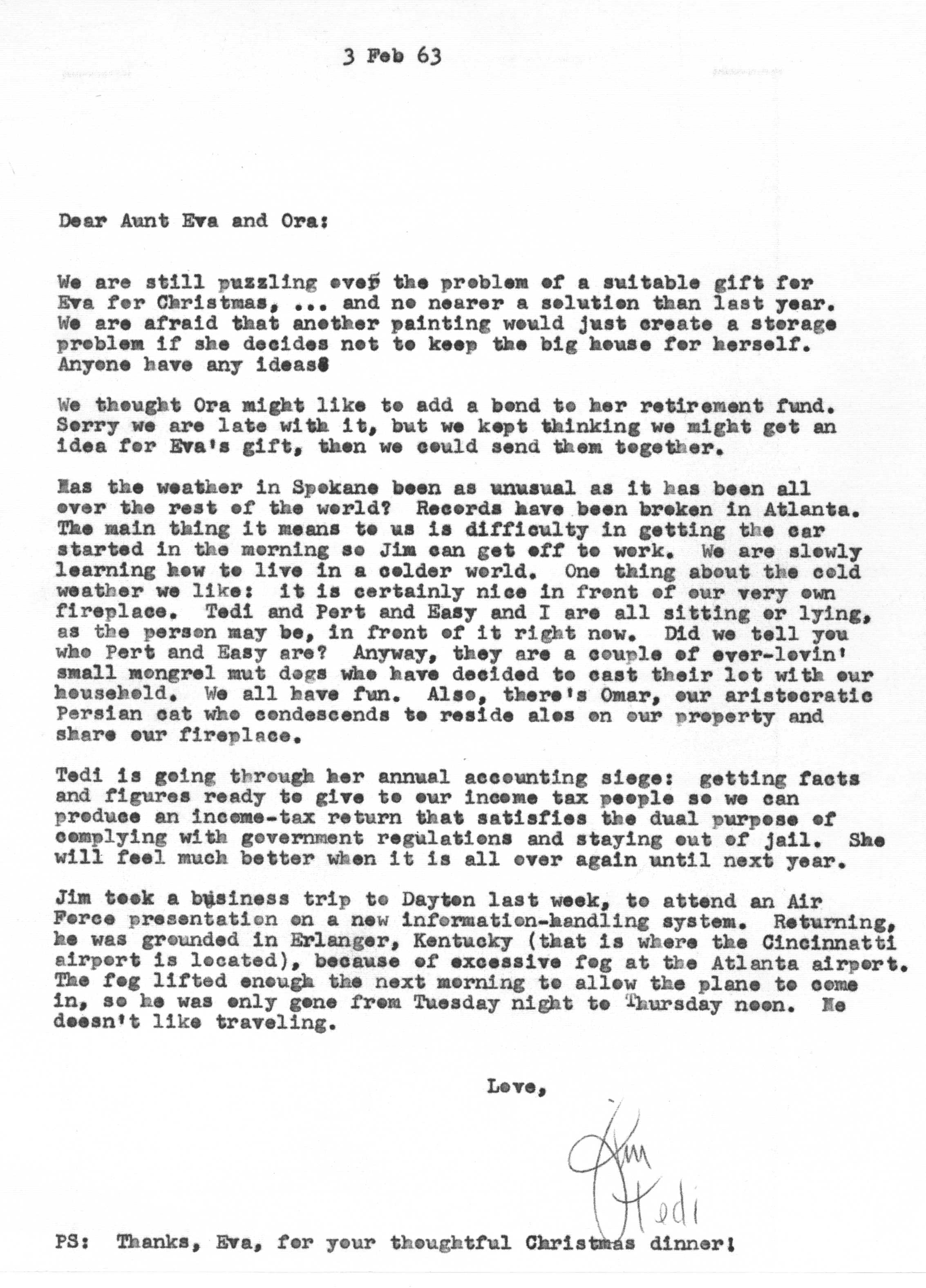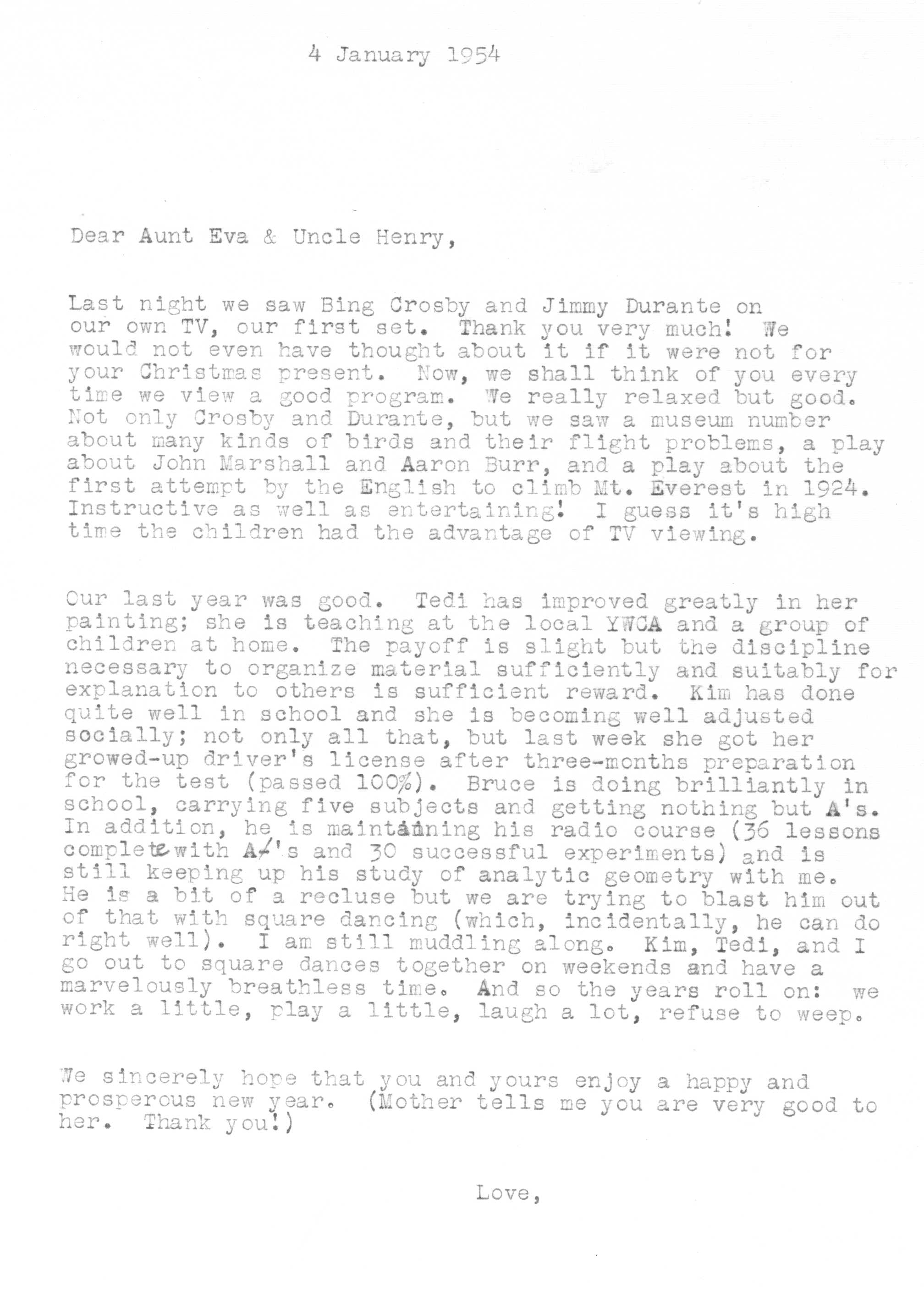 Because of Jimmy's care in keeping a carbon copy of each letter he wrote, we have a fairly detailed history of Tedi and Jimmy's moods and movements from 1942 to 1963 through the letters he exchanged with his Aunt Eva George (nee Eva Gwendoline Stumpf, a sister of Jimmy's father Craig Edgar Stumpf). Apparently, Craig had helped Eva attend the University of Michigan in Ann Arbor, where she met and married Henry George, and Eva tried to repay his kindness by supplying continuing financial assistance throughout the period 1944-1963 and perhaps even before. A name which arises frequently in the Henry/Eva George chronology is that of Ora Enterline, a member of the Stumpf family somewhat removed and who never married, but who was close to Eva as a companion throughout her life, who also lived with Jim's Aunt Violet in Alturas, Florida during part of the year, and who also was of great assistance to the Strashun side of the family during their last days in Los Angeles in the late 1950s and early 1960s.. Dates of interest are -- Craig Edgar Stumpf (1870-1924), Eva Gwendoline Stumpf (George) (1887-1963), Henry George (1883-1962), and Ora Enterline (1892-?).