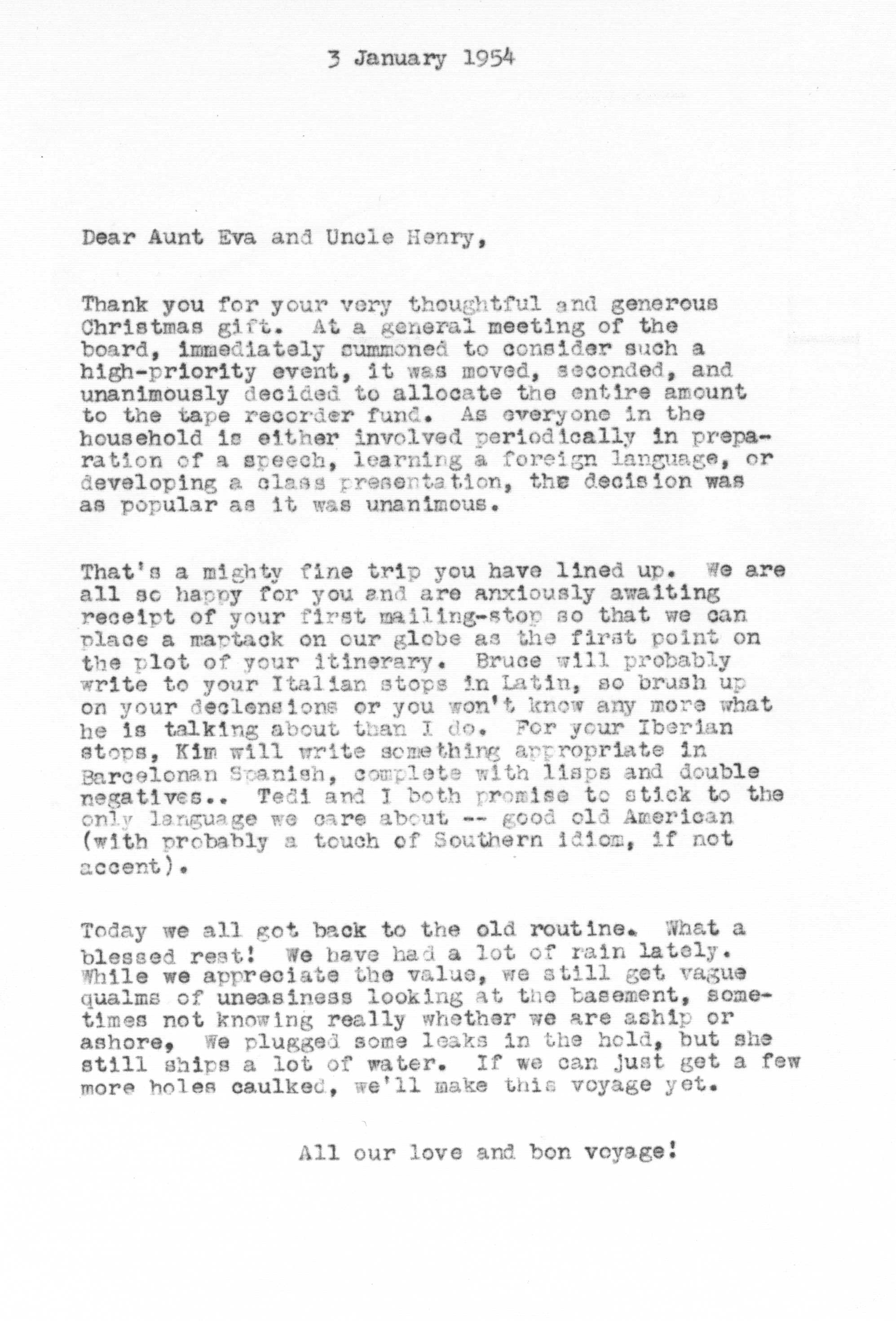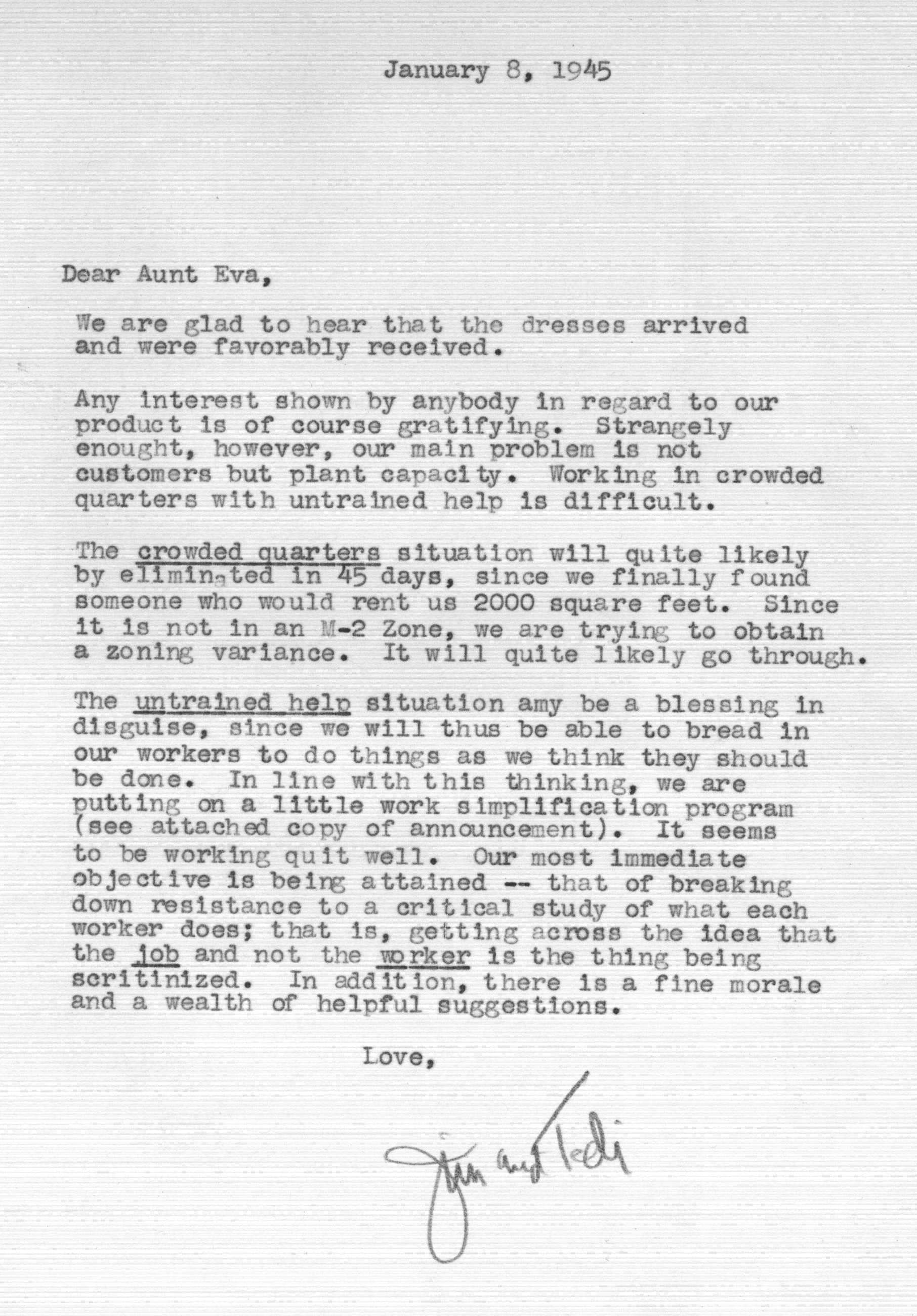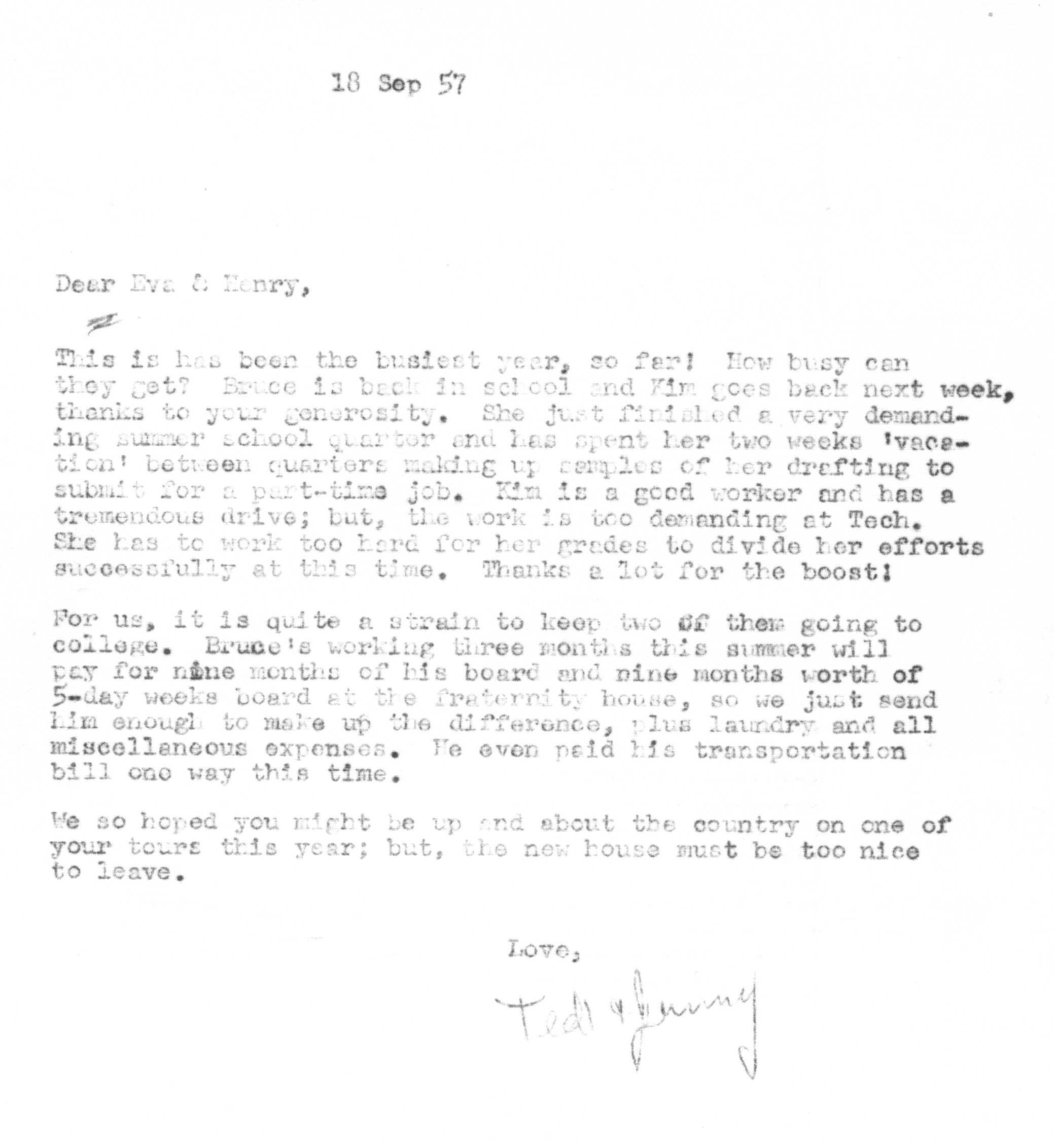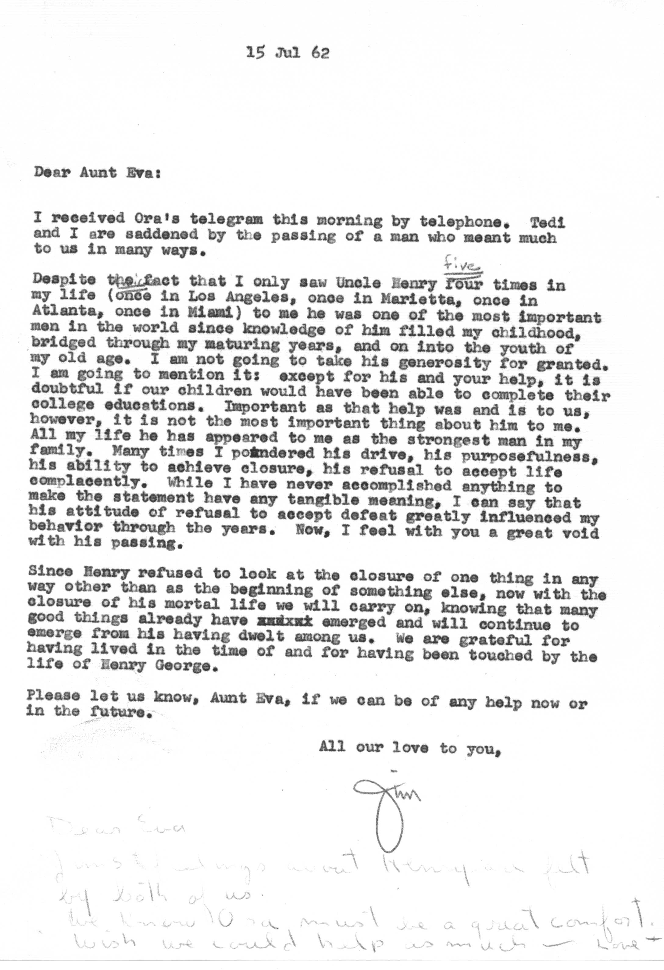 Because of Jimmy's care in keeping a carbon copy of each letter he wrote, we have a fairly detailed history of Tedi and Jimmy's moods and movements from 1942 to 1963 through the letters he exchanged with his Aunt Eva George (nee Eva Gwendoline Stumpf, a sister of Jimmy's father Craig Edgar Stumpf). Apparently, Craig had helped Eva attend the University of Michigan in Ann Arbor, where she met and married Henry George, and Eva tried to repay his kindness by supplying continuing financial assistance throughout the period 1944-1963 and perhaps even before. A name which arises frequently in the Henry/Eva George chronology is that of Ora Enterline, a member of the Stumpf family somewhat removed and who never married, but who was close to Eva as a companion throughout her life, who also lived with Jim's Aunt Violet in Alturas, Florida during part of the year, and who also was of great assistance to the Strashun side of the family during their last days in Los Angeles in the late 1950s and early 1960s.. Dates of interest are -- Craig Edgar Stumpf (1870-1924), Eva Gwendoline Stumpf (George) (1887-1963), Henry George (1883-1962), and Ora Enterline (1892-?).