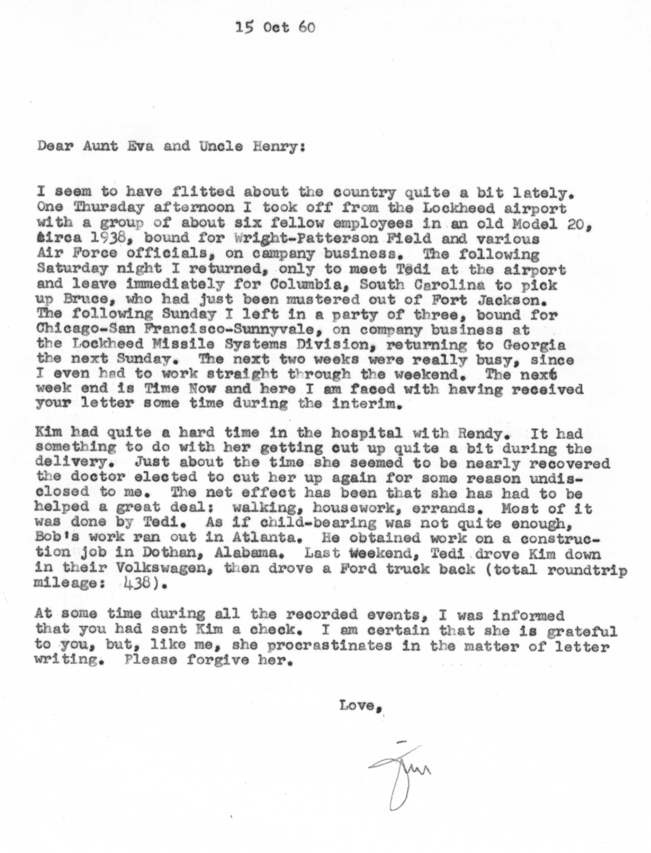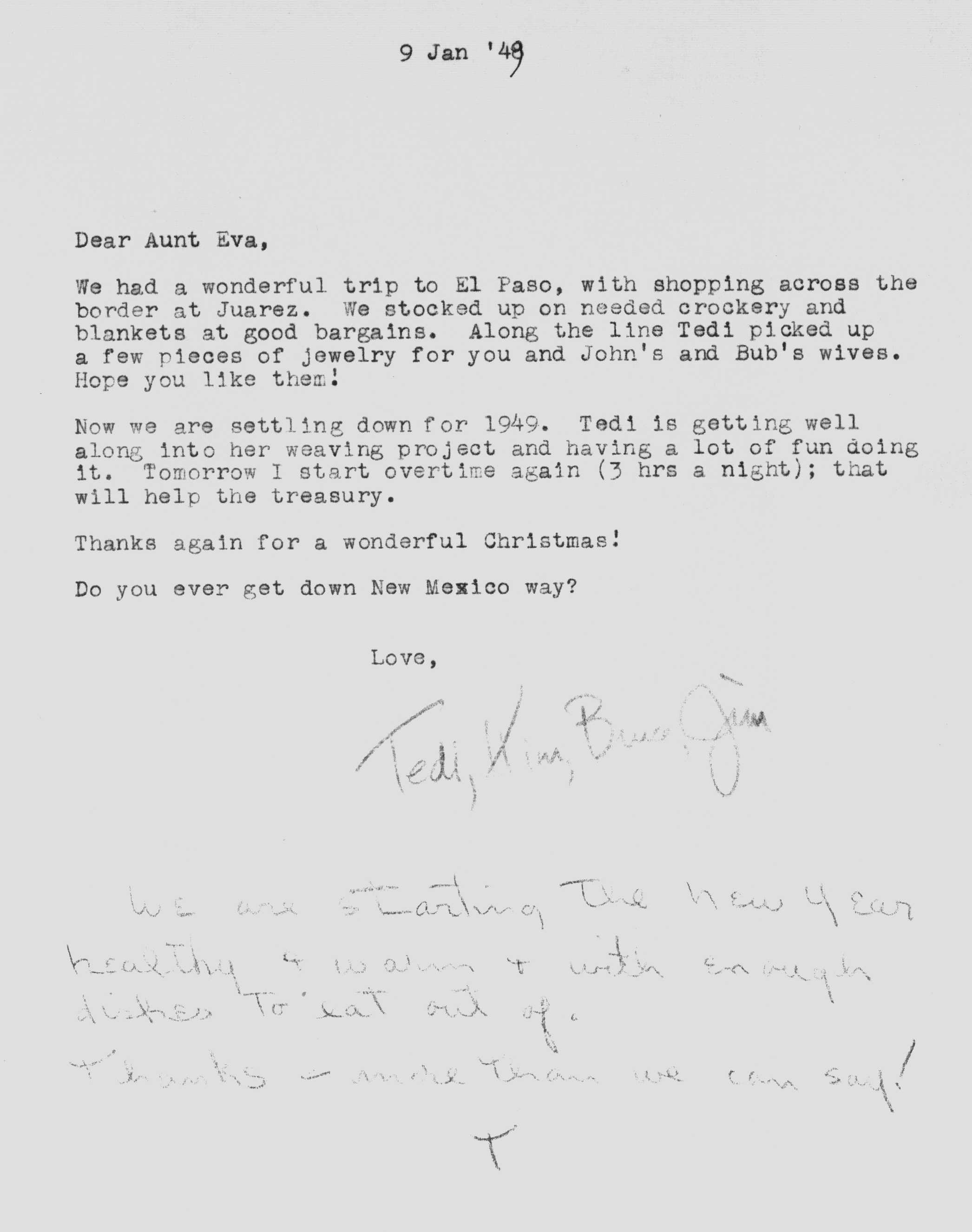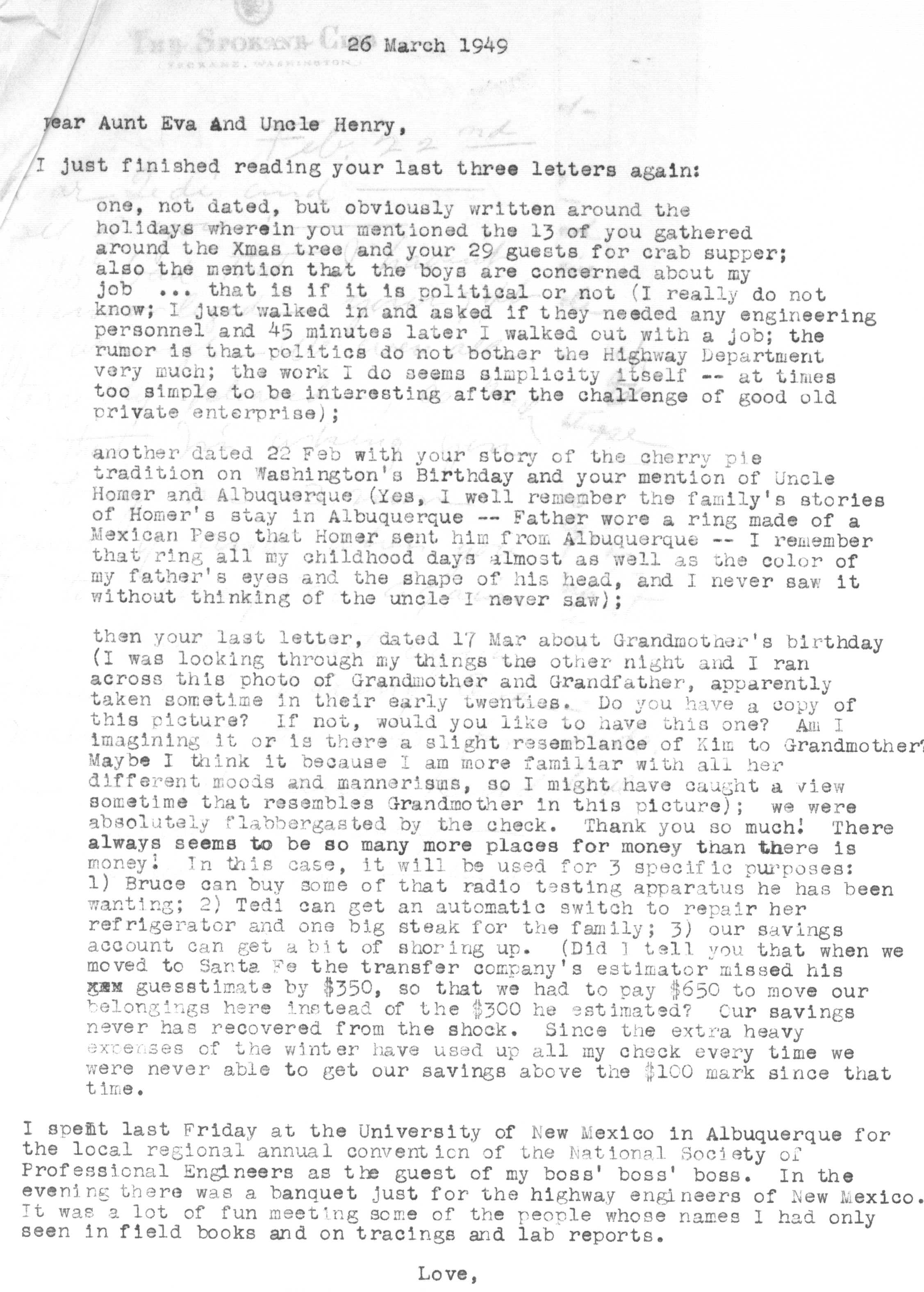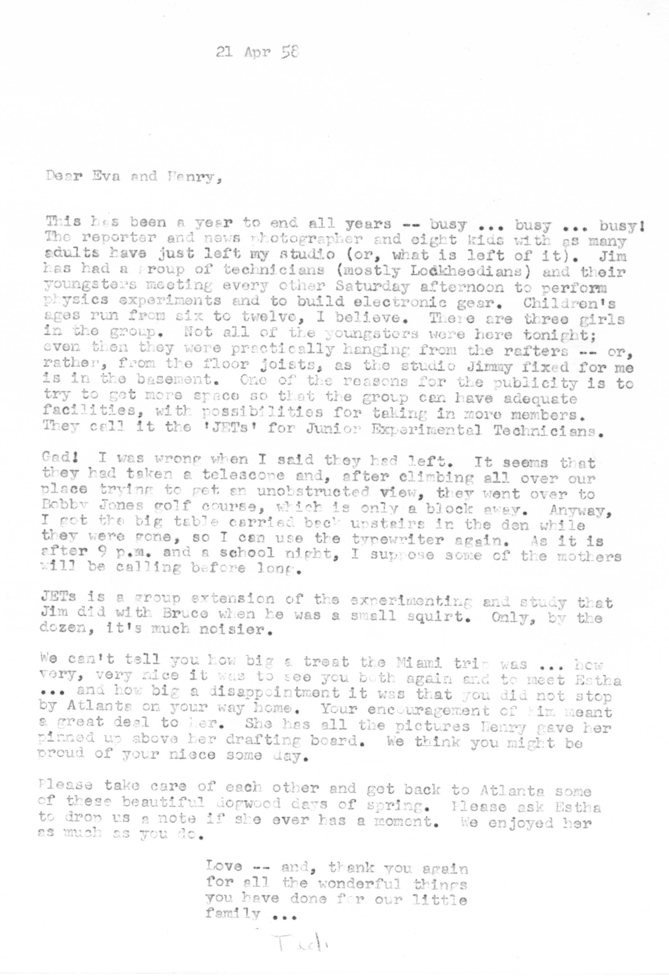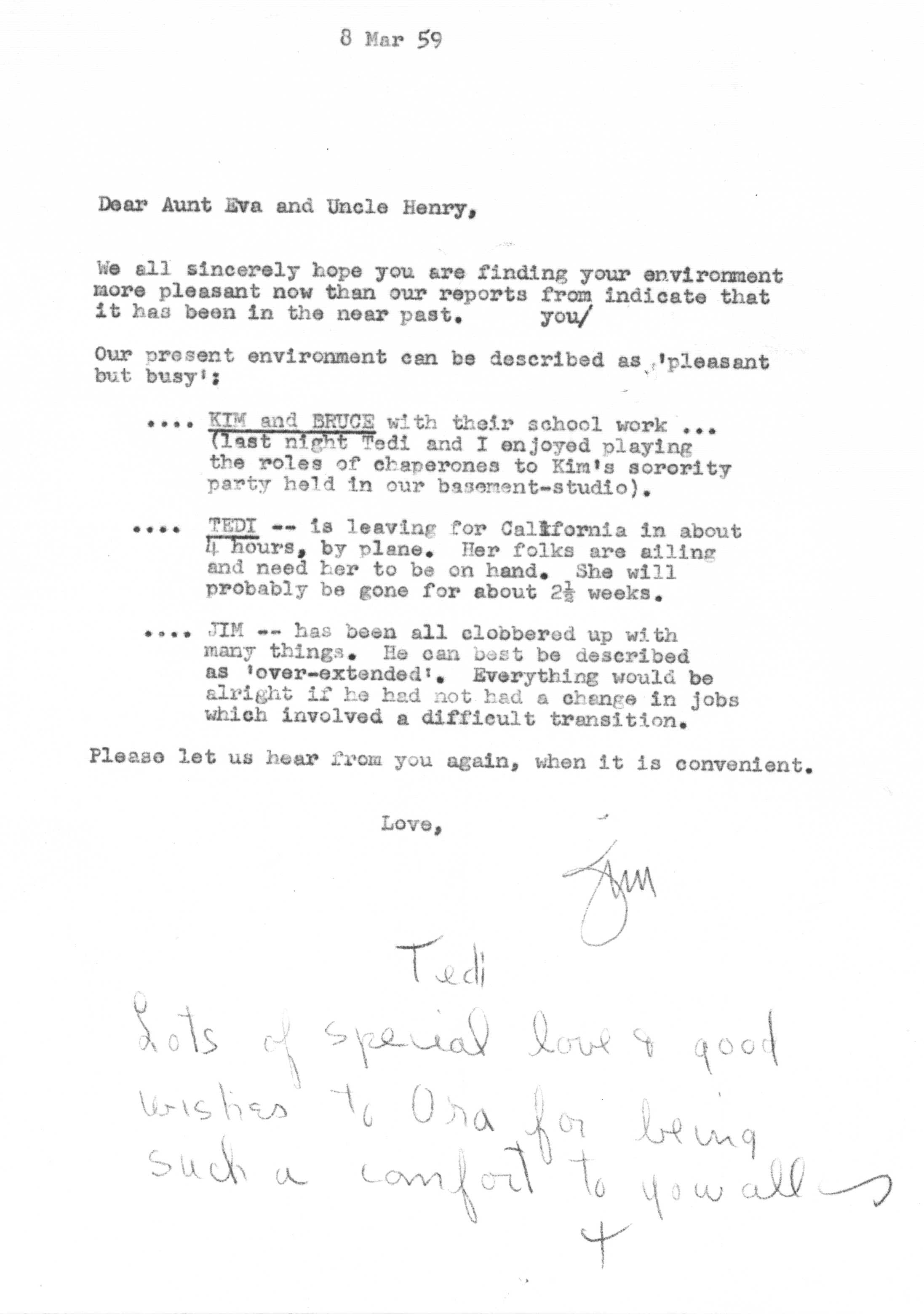 The sequence of Tedi and Jimmy's moves around the country is roughly as follows -- Los Angeles after their marriage in 1936 to 1948, Santa Fe from 1948 to 1950, Lubbock from 1950 to 1951, Marietta from 1951 to 1954 and Atlanta from 1954 on. Jimmy spent a portion of the years 1942 and 1943 working as a surveyor on the Pan American Highway in Costa Rica, Nicaragua, Guatemala, and Panama as an employee of the Army Corps of Engineers.