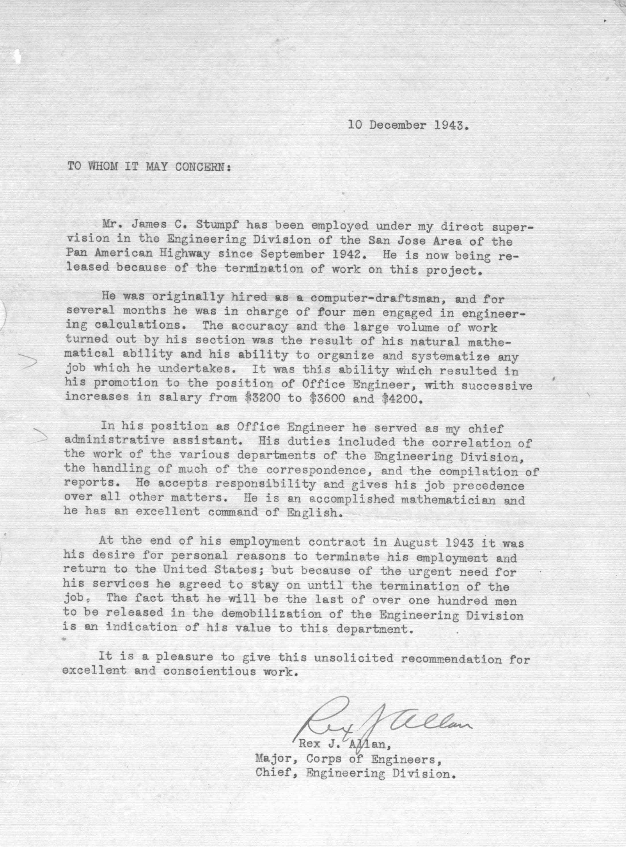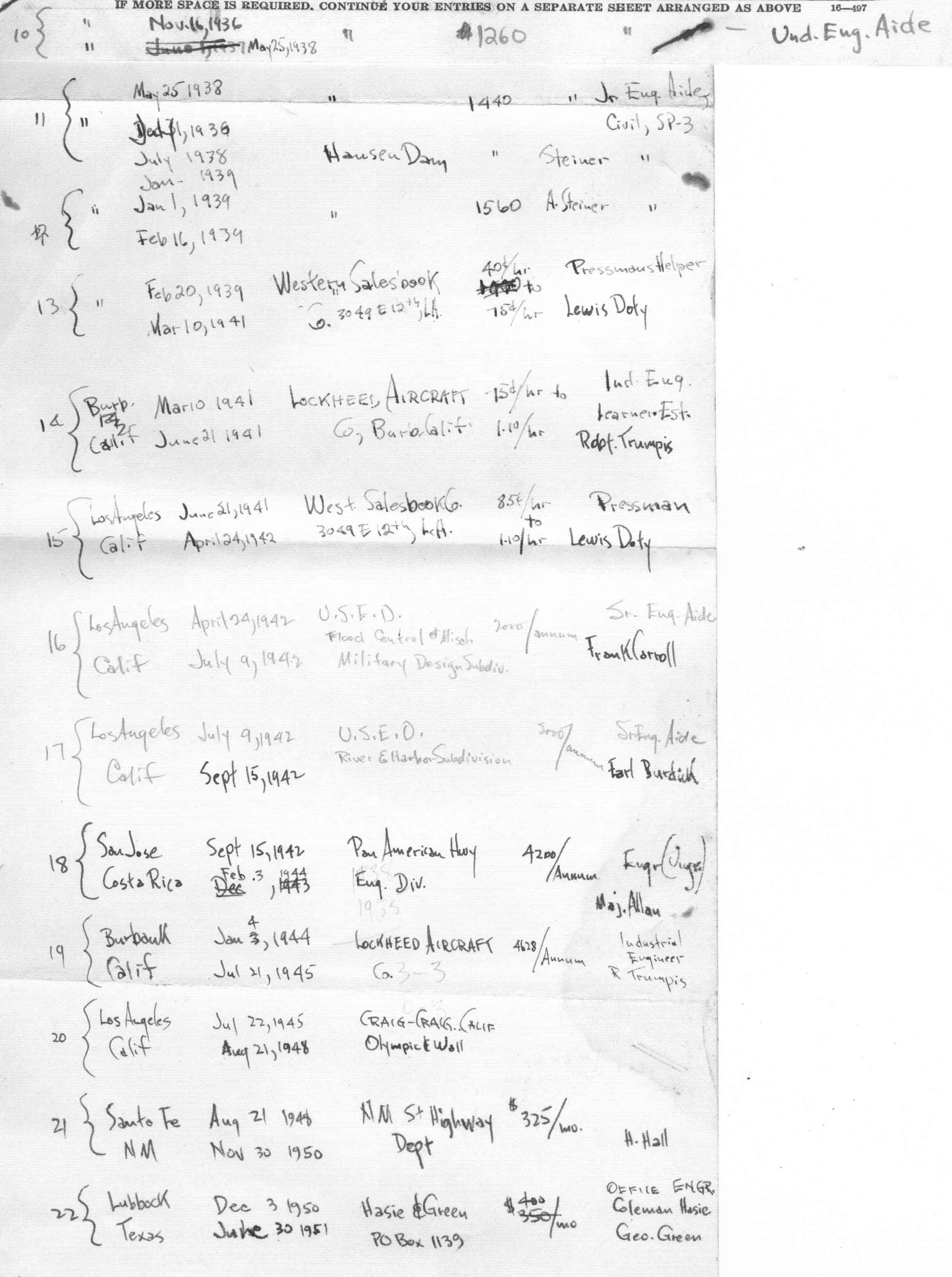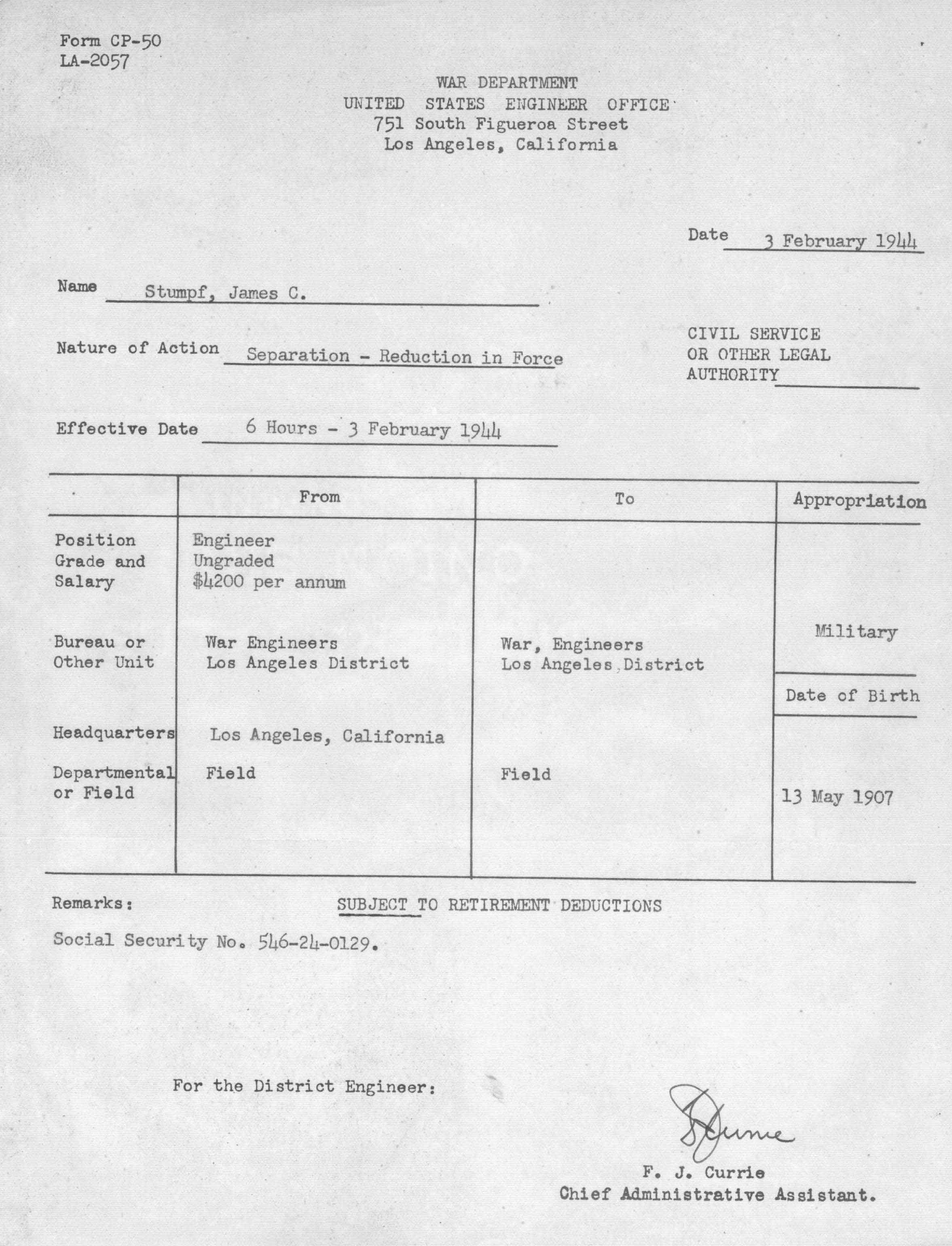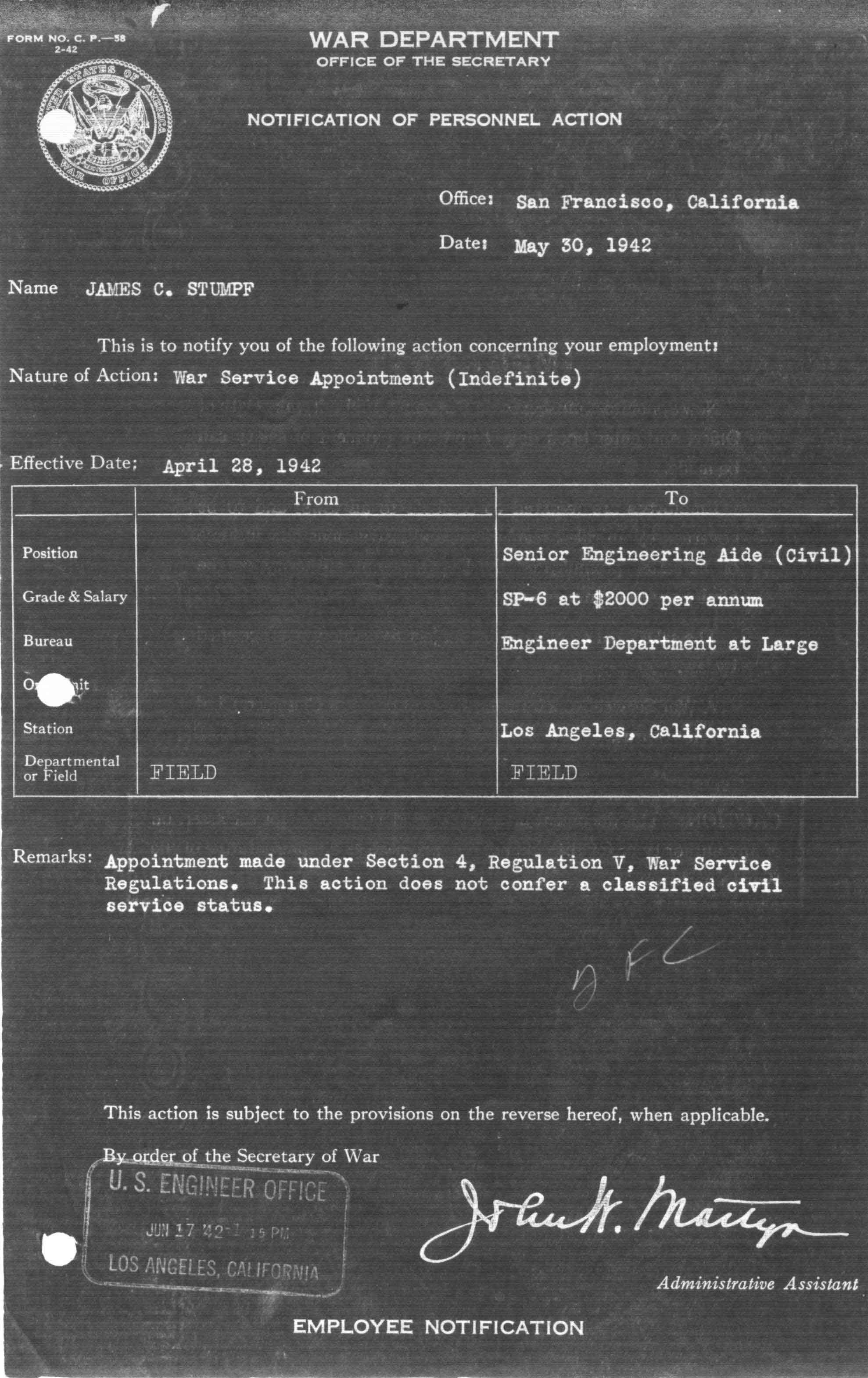 Jimmy was born James Craig Stumpf on May 13, 1907 in Uniontown, PA. It appears that his grandfather, John Rowe Stumpf had bought land in Lodi in 1907 with the intention of moving out here to grow grapes, but never did. In 1914, Jimmy’s immediate family of three -- himself, his mother Rachel Louise (Babinger) Stumpf, and his father Craig Edgar Stumpf – moved from Uniontown, PA to Lodi, CA, and then in August of 1923 made a second move to Glendale, CA, where Jimmy spent his senior year at Glendale High School. The moves were apparently prompted by Craig Edgar’s asthma, who had gone to Glendale earlier (in February of 1923) to look at the weather before moving the family there between Jimmy’s junior and senior years in high school. Unfortunately, Craig Edgar died in 1924, only a year after their move to Glendale, forcing Jimmy to withdraw his application to Stanford University. Jimmy lived with and supported his mother Rachel in the Glendale area for the next 14 years (until 1937), during several of which he delivered newspapers on his Indian motorcycle. Sometime between 1936 and 1937, Jimmy married Tedi (Henrietta Halliwell Strashun) and in January of 1937 they bought a house at 357 Mavis Drive in Glendale, CA. A good summary of Jimmy's educational experience is found under Jimmy Security Questionnaire below, and a good summary of his work experience is found under Work History and Work Experience.