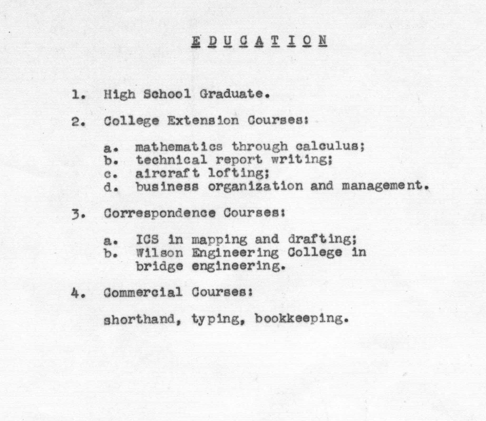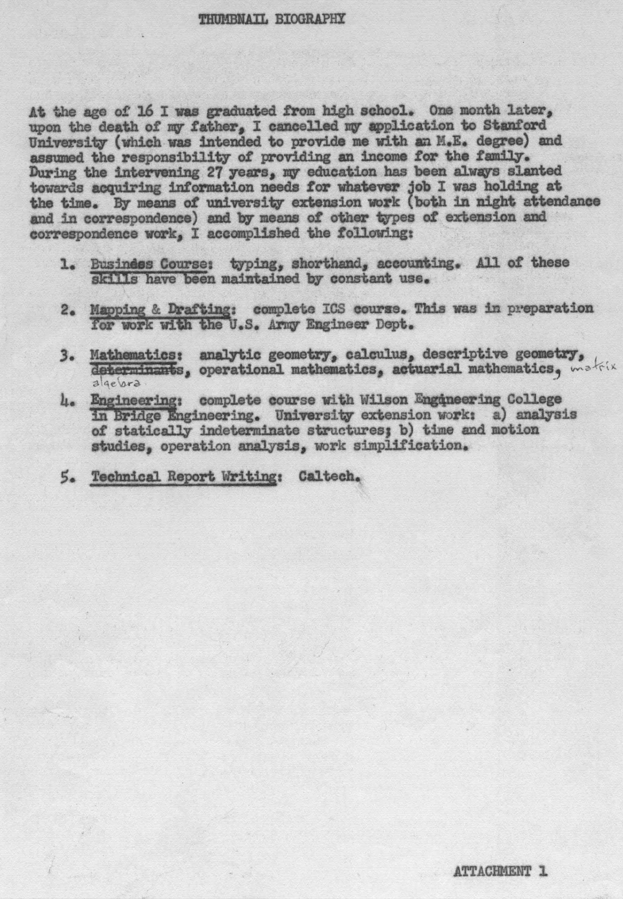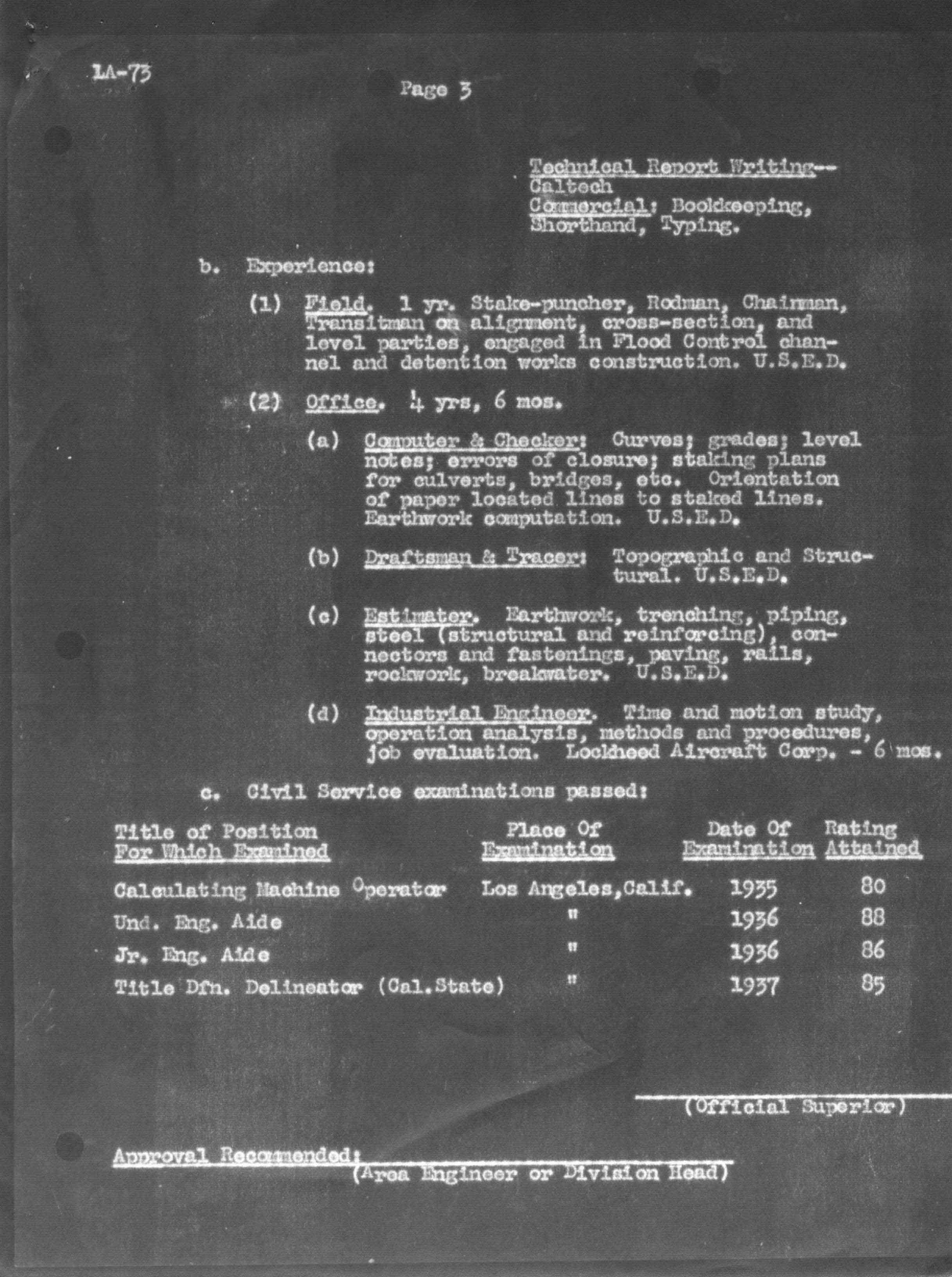 Jimmy was born James Craig Stumpf on May 13, 1907 in Uniontown, PA. It appears that his grandfather, John Rowe Stumpf had bought land in Lodi in 1907 with the intention of moving out here to grow grapes, but never did. In 1914, Jimmy’s immediate family of three -- himself, his mother Rachel Louise (Babinger) Stumpf, and his father Craig Edgar Stumpf – moved from Uniontown, PA to Lodi, CA, and then in August of 1923 made a second move to Glendale, CA, where Jimmy spent his senior year at Glendale High School. The moves were apparently prompted by Craig Edgar’s asthma, who had gone to Glendale earlier (in February of 1923) to look at the weather before moving the family there between Jimmy’s junior and senior years in high school. Unfortunately, Craig Edgar died in 1924, only a year after their move to Glendale, forcing Jimmy to withdraw his application to Stanford University. Jimmy lived with and supported his mother Rachel in the Glendale area for the next 14 years (until 1937), during several of which he delivered newspapers on his Indian motorcycle. Sometime between 1936 and 1937, Jimmy married Tedi (Henrietta Halliwell Strashun) and in January of 1937 they bought a house at 357 Mavis Drive in Glendale, CA. A good summary of Jimmy's educational experience is found under Jimmy Security Questionnaire below, and a good summary of his work experience is found under Work History and Work Experience.