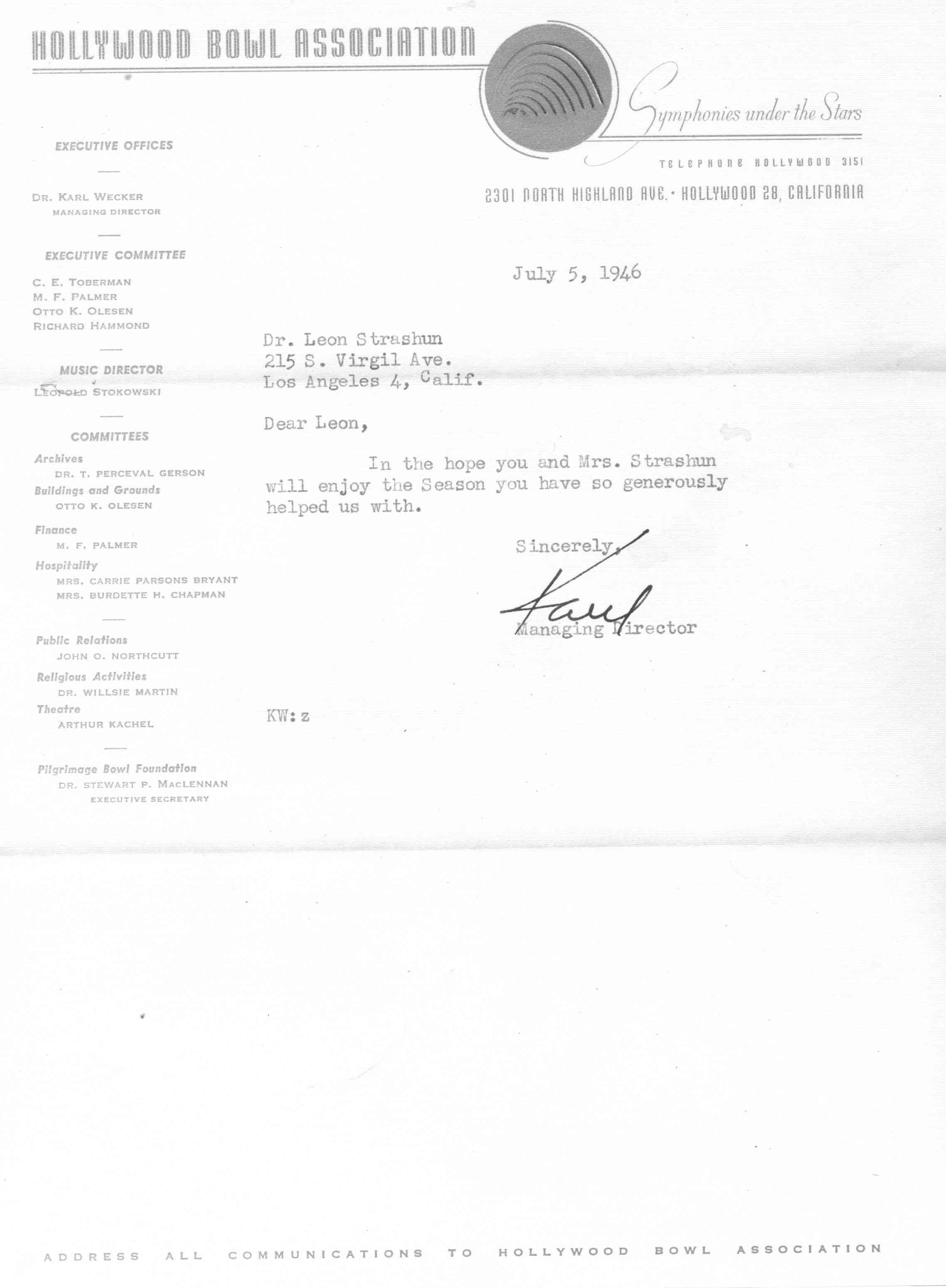 07/05/1946 -- Letter from Karl Wecker at Hollywood Bowl