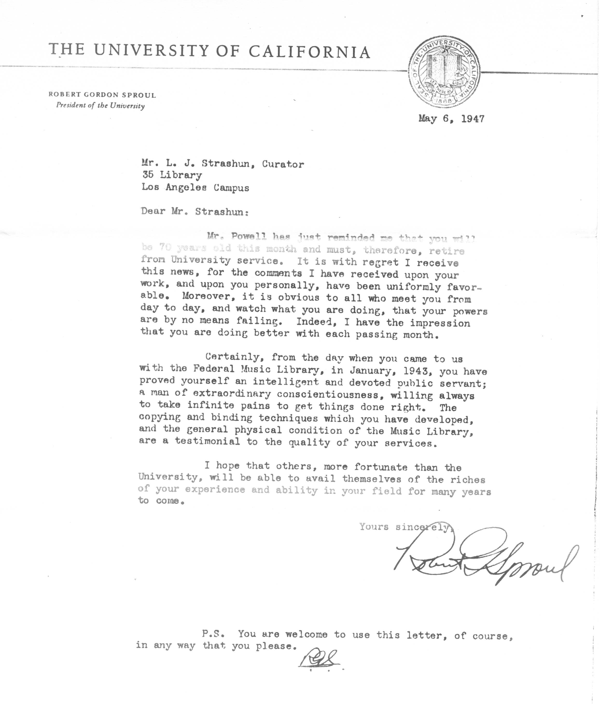 05/06/1947 -- Letter from Robert Gordon Sproul, UC President