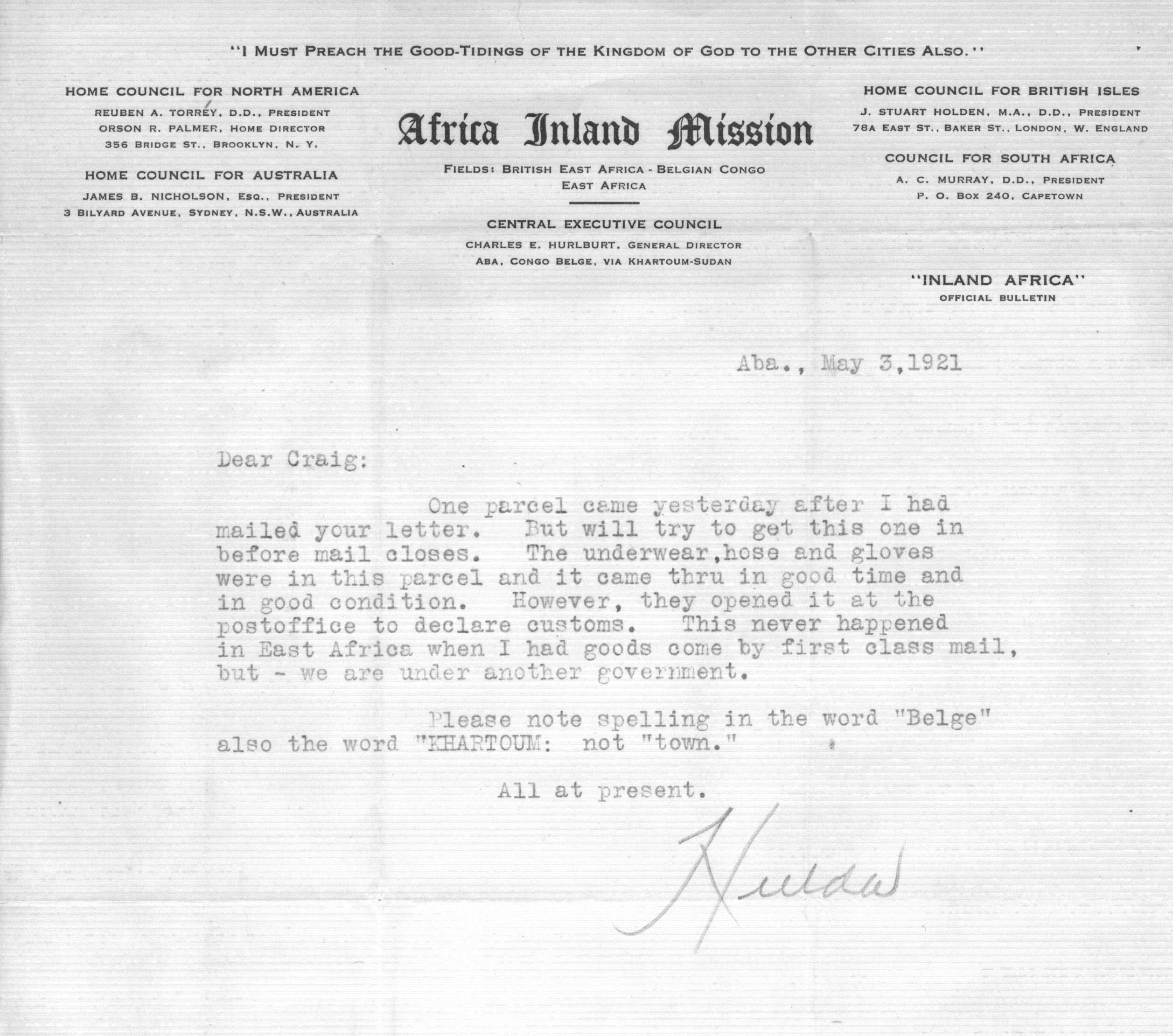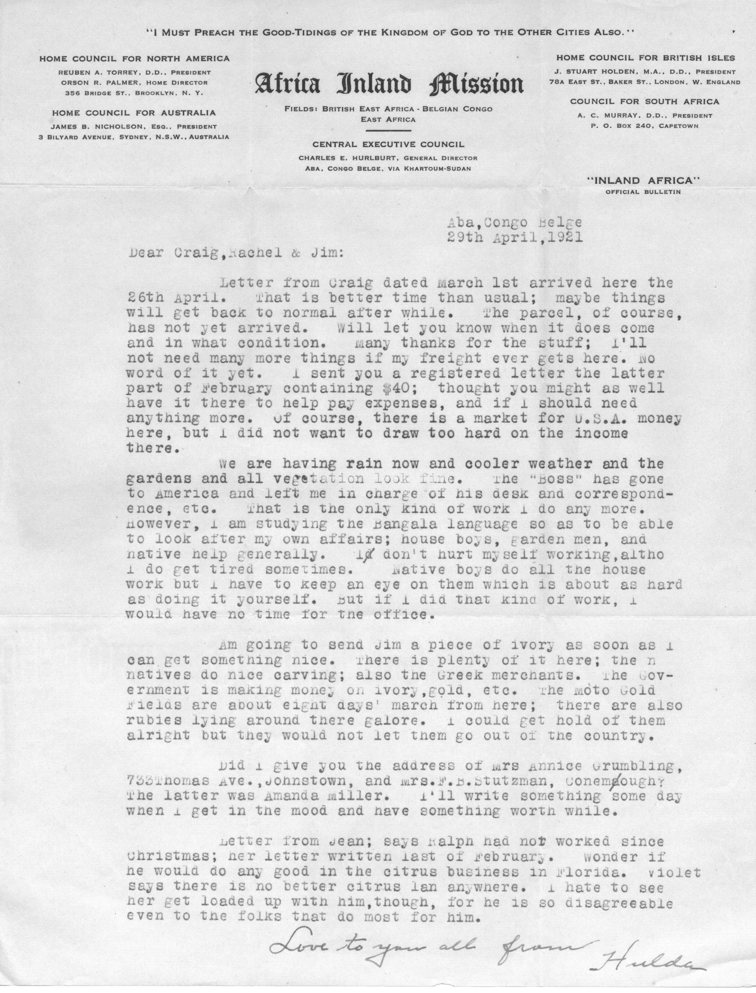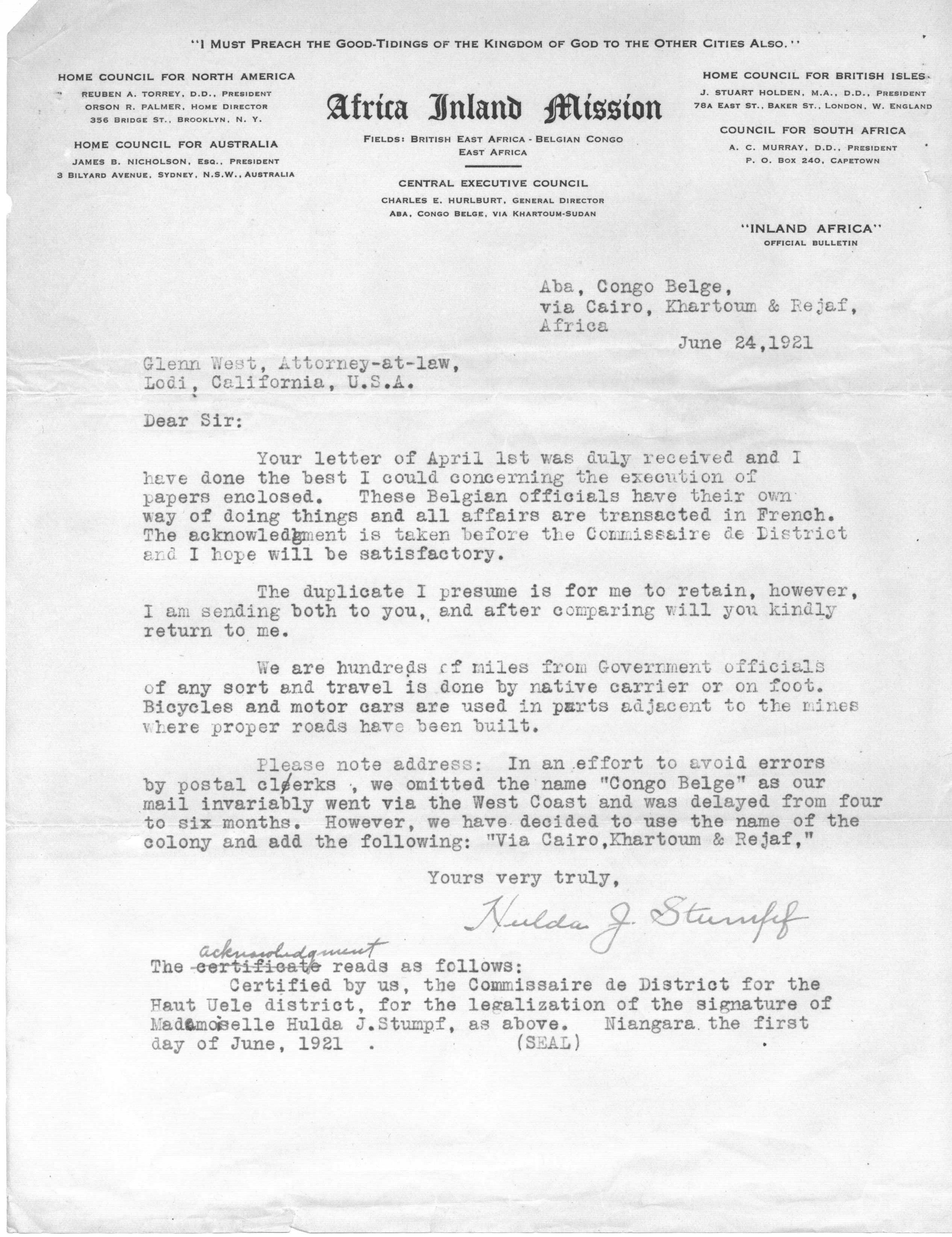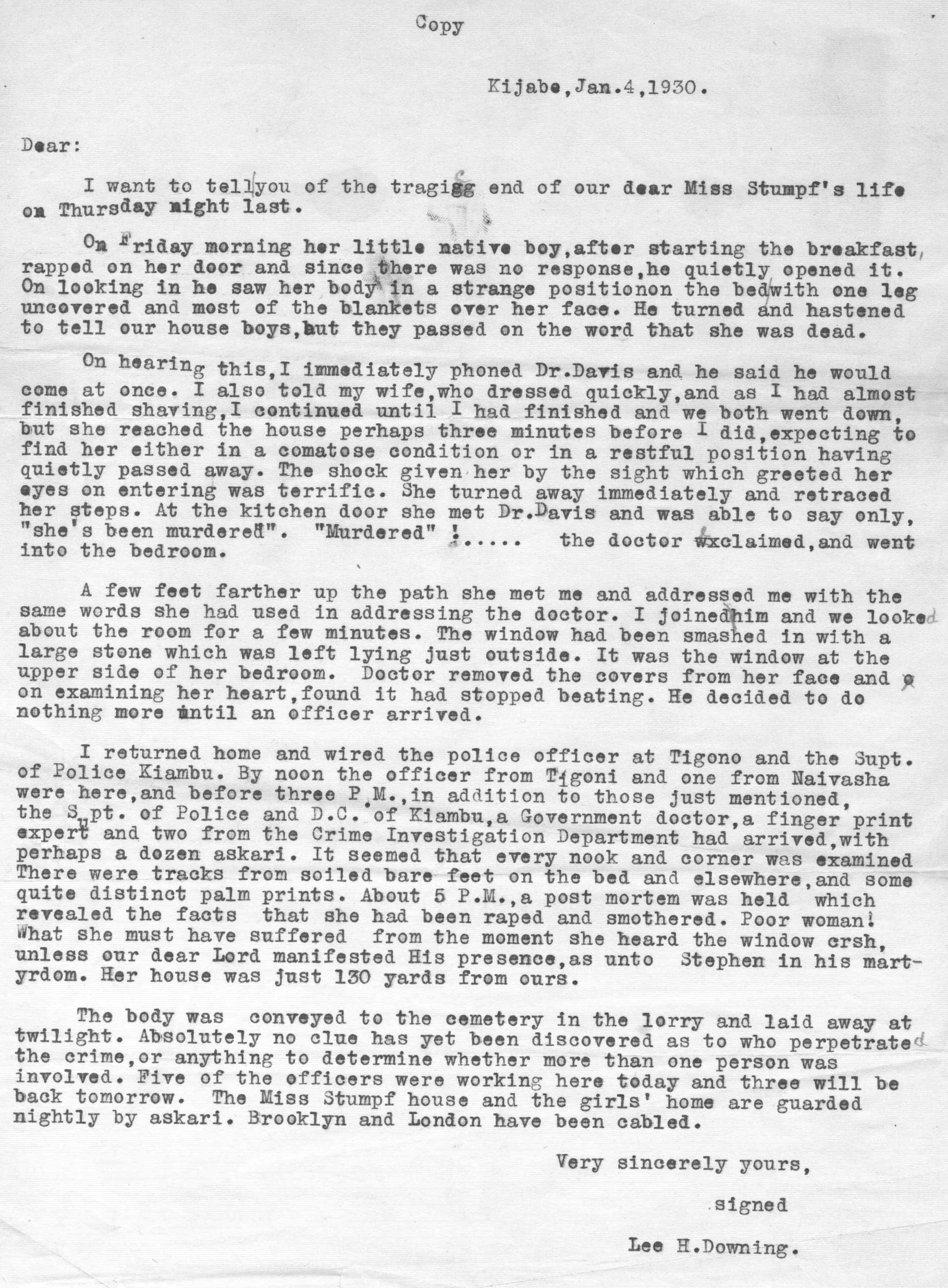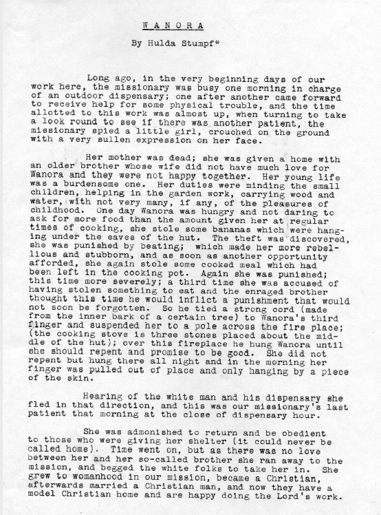 Hulda Jane Stumpf was born Jan. 10, 1867 on a farm near Pine Flats, Indiana County, PA. and died in Kijabe, Kenya Colony, East Africa, on January 3rd, 1930. She was one of the children of J. R. Stumpf, the other children being Craig E., Violet M., Ralph, Eva G., Willis C., and Homer F. She took business courses which enabled her to aid her father in his ambitious department store enterprises (including the Stumpf five and ten cent stores!). At one time she was a court stenographer and later taught at Blair Business College in Indiana, PA. She was said to have had a fine soprano voice, having taken training in New York. In 1908 (in her early 40s) her deep-seated religious leanings led her to become a missionary to Africa under the non-denominational missionary society African Inland Mission of America. She served there 22 years, first in Kijabe, British East Africa, then in Kenya, Belgian Congo, and then returning to Kijabe. She was a teacher and later did secretarial work for the mission. She was one of a party that entertained President Theodore Roosevelt before his famous safari into the big game hunting jungles. In January of 1930 Hulda Stumpf was martyred, allegedly murdered by a native, the reason for the murder having no known justification but is supposed to be linked to her opposition to an unchristianlike native custom toward native young girls (female circumcision). It is reported that in this tribe, as in others, a man's wealth was reckoned according to the number of goats he possessed, therefore would offer a daughter to the man who, in return, would exchange the most goats, regardless of the maiden's wishes. Influenced by Christian teachings, the native girls began to flee to the mission for rescue from this and other primitive practices, and it is supposed that some irate native father, in protest against the mission's interference, sought revenge to the extent of taking Hulda's life. It is alleged that someone broke a window (she was rather deaf), entered the little home where she lived alone, tied a pillow around her face to stifle her cries, then left her to die; she is said to have died of strangulation (as well as circumcision and rape). Her grave is in Johannesburg, South Africa. Between 1893 and 1906 she had returned to Pennsylvania to care for her aged parents during their last illnesses and deaths. During these years back home Hulda prepared the Stumpf family history. (Extracted and edited from Eisenhower Lineage & Reference by Fannie B. Taylor-Richardson, 1957)